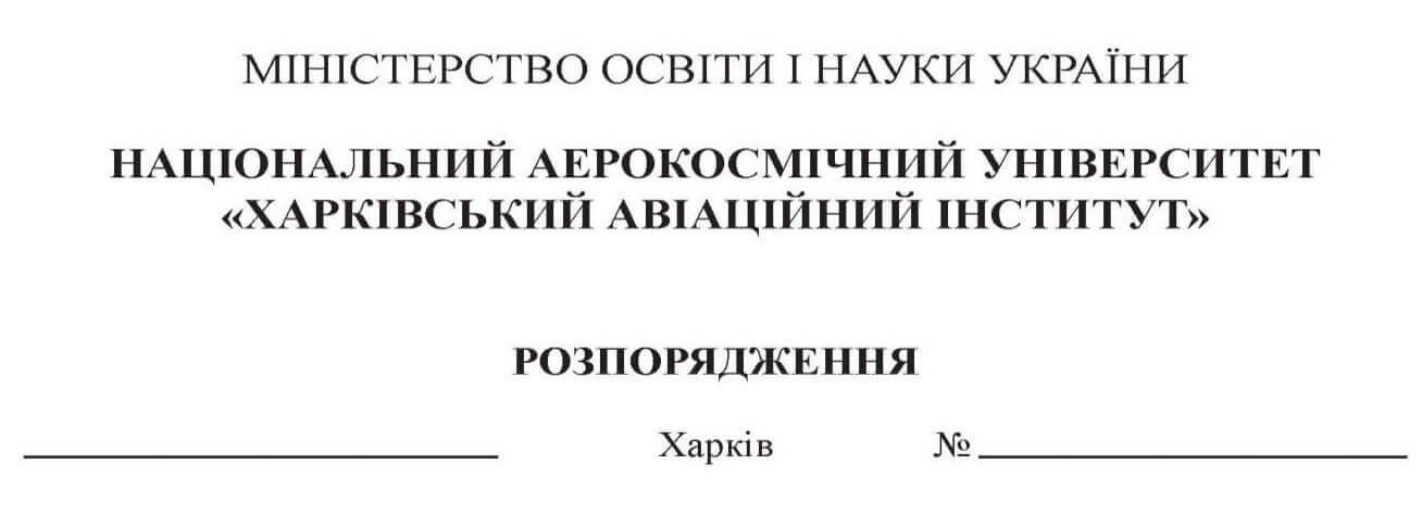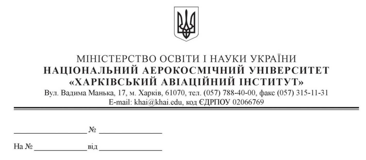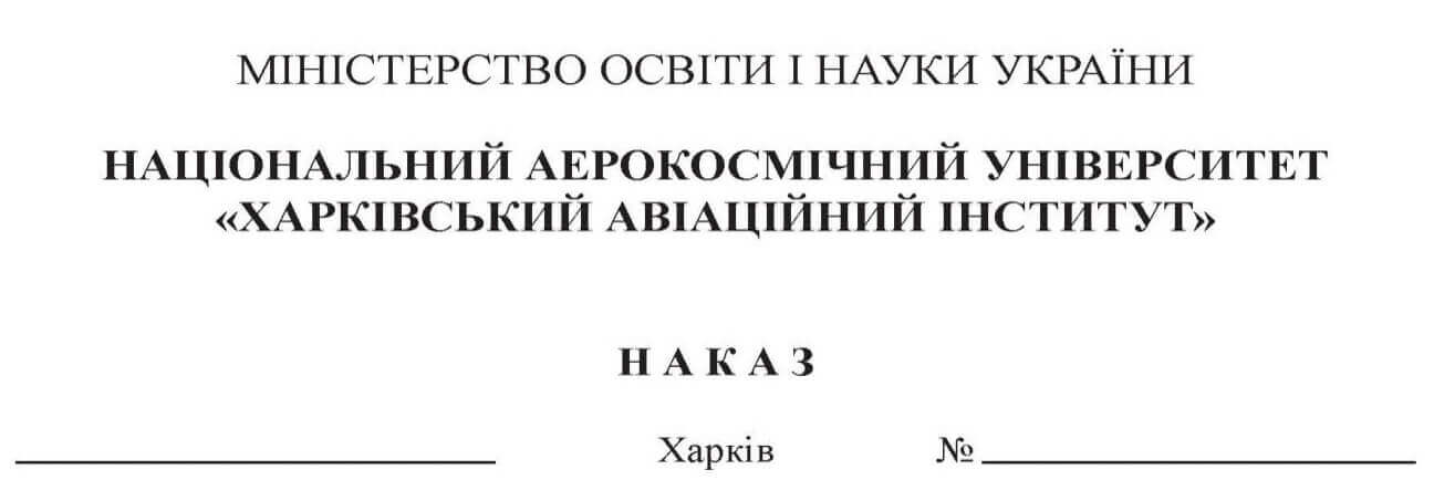 2.21 Найменування Університету, автора документа, у тому числі скорочене (ХАІ), має відповідати найменуванню, яке міститься в Статуті та в Єдиному державному реєстрі юридичних осіб, фізичних осіб-підприємців та громадських формувань. Скорочене найменування може розміщуватися (у дужках або без них) нижче від повного найменування окремим рядком по центру документа.