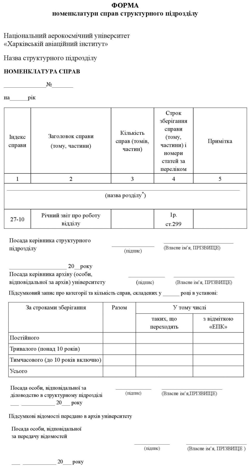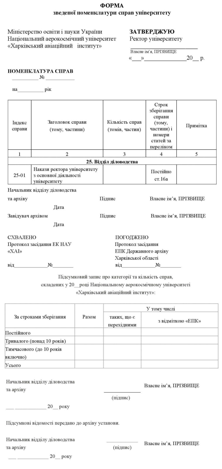 - розробляє Інструкцію (зміни до неї) та зведену Номенклатуру справ Університету;
