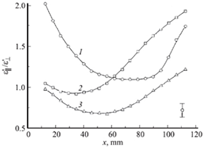 Залежність дійсної частини діелектричної проникності кристалів ZnSe від їх віддаленості від початку кристалічного злитка, виміряні за різних частот електричного поля