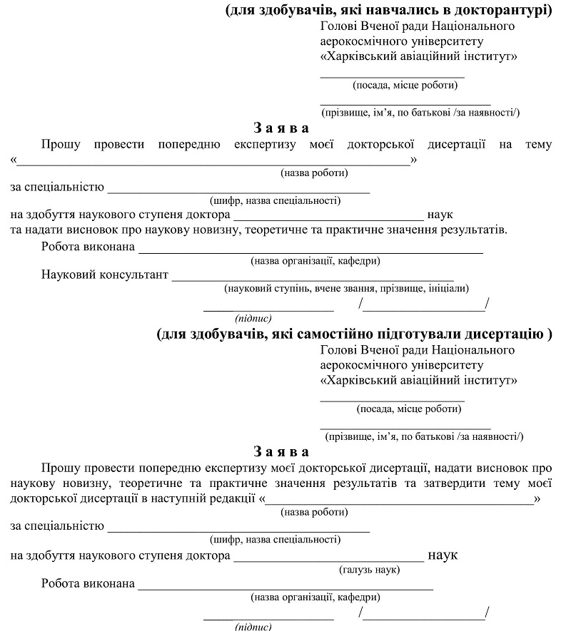 4.3. Здобувач, підготовка якого здійснювалася в докторантурі іншого ЗВО / наукової установи, а також здобувач, який не проходив підготовку в докторантурі, а самостійно підготував докторську дисертацію і не є працівником Університету, звертається з письмовою заявою до голови вченої ради Університету про проведення попередньої експертизи його докторської дисертації та надання висновку про наукову новизну, теоретичне та практичне значення її результатів (а у випадку самостійної підготовки – також і затвердження теми докторської дисертації).