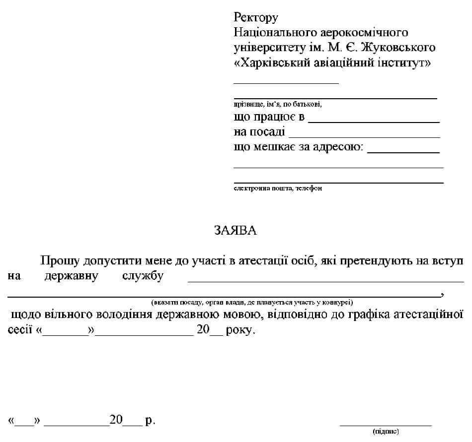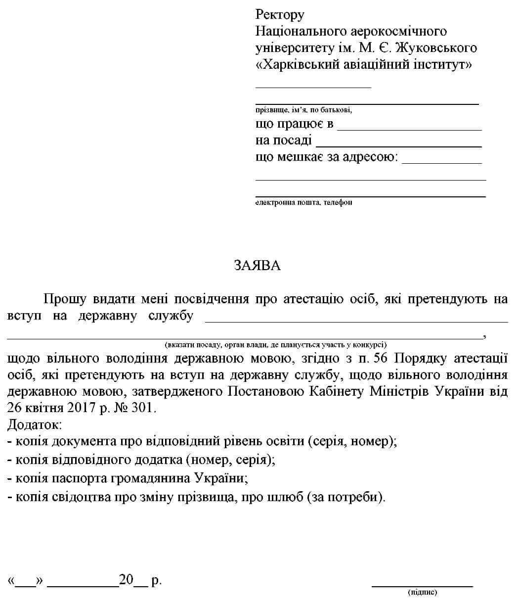 1.1 Положення про атестацію осіб, які претендують на вступ на державну службу, щодо вільного володіння державною мовою (далі - положення) розроблено згідно Постанови КМУ від 26 квітня 2017 р. № 301 «Про організацію проведення атестації осіб, які претендують на вступ на державну службу, щодо вільного володіння державною мовою» і визначає порядок проведення такої атестації у Національному аерокосмічному університеті «Харківській авіаційний інститут» (далі - Університет).