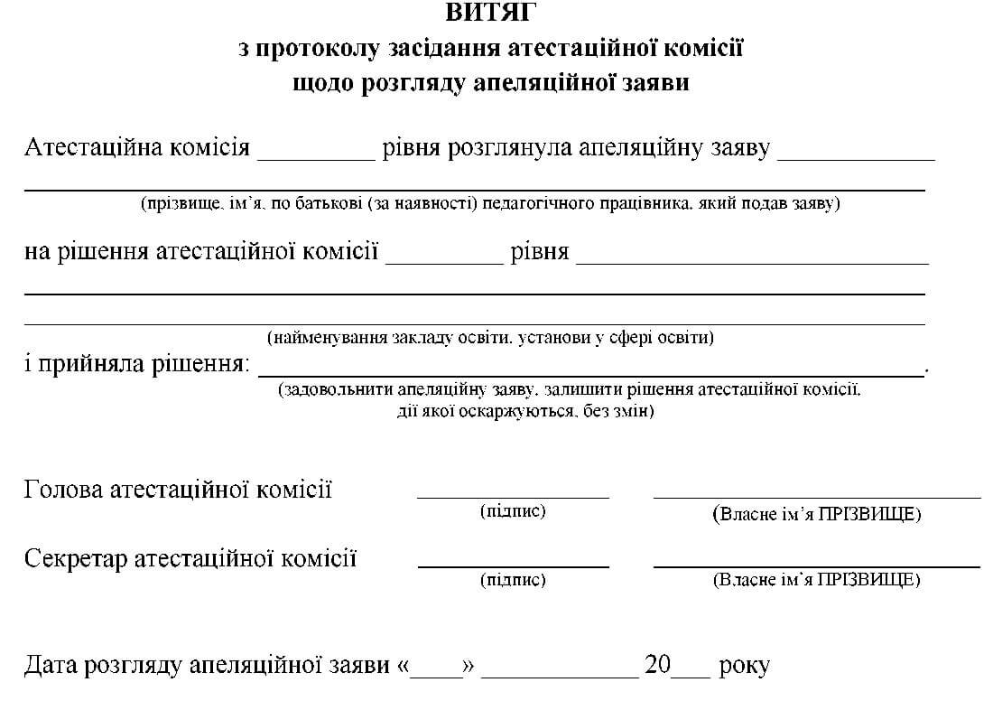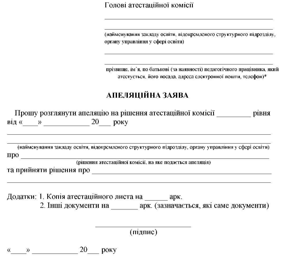 До апеляційної заяви додаються копія атестаційного листа, виданого атестаційною комісією, рішення якої оскаржується, копії документів, що подавалися педагогічним працівником до атестаційної комісії, рішення якої оскаржується (у разі їхнього подання).