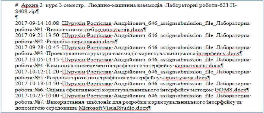 - ім’я всіх файлів з результатами навчання всіх студентів групи з окремої дисципліни та окремого виду електронного документу;