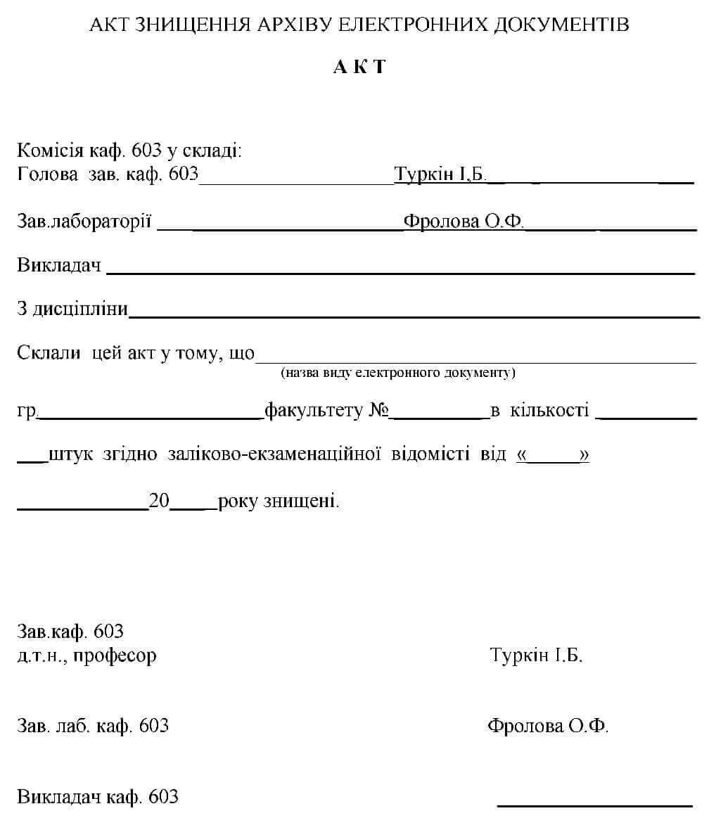 5.2 Знищення архівів електронних документів на носіях здійснюється призначеною комісією зі складанням відповідного акту видаленням відповідних файлів. Форма акту наведено у додатку А.