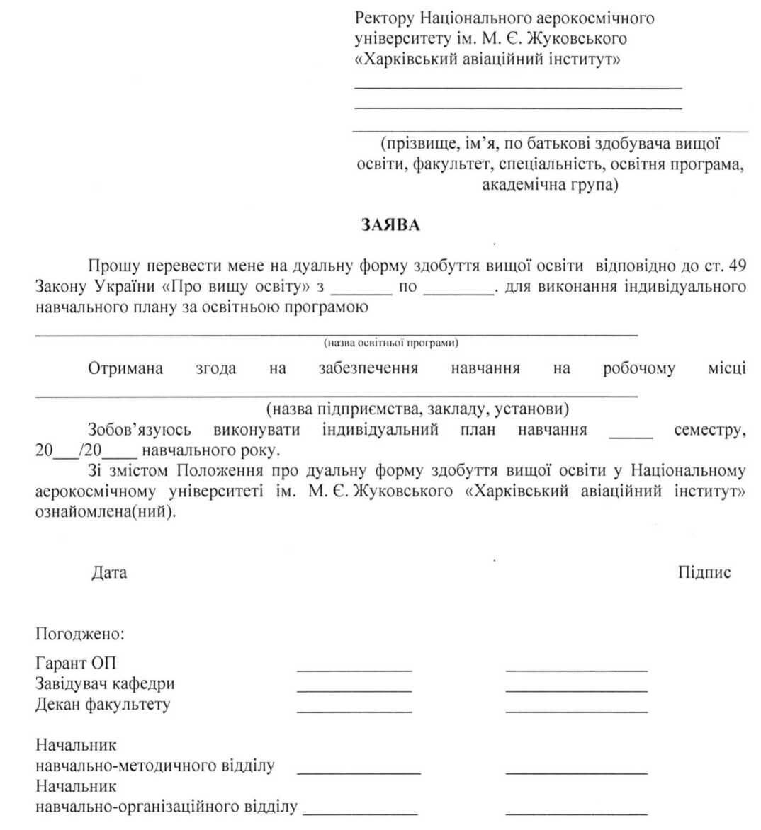 4.4 До початку нового семестру (навчального року) здобувані вищої освіти, які виявили бажання навчатися за дуальною формою, подають відповідну заяву на ім’я ректора.