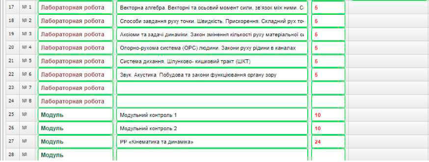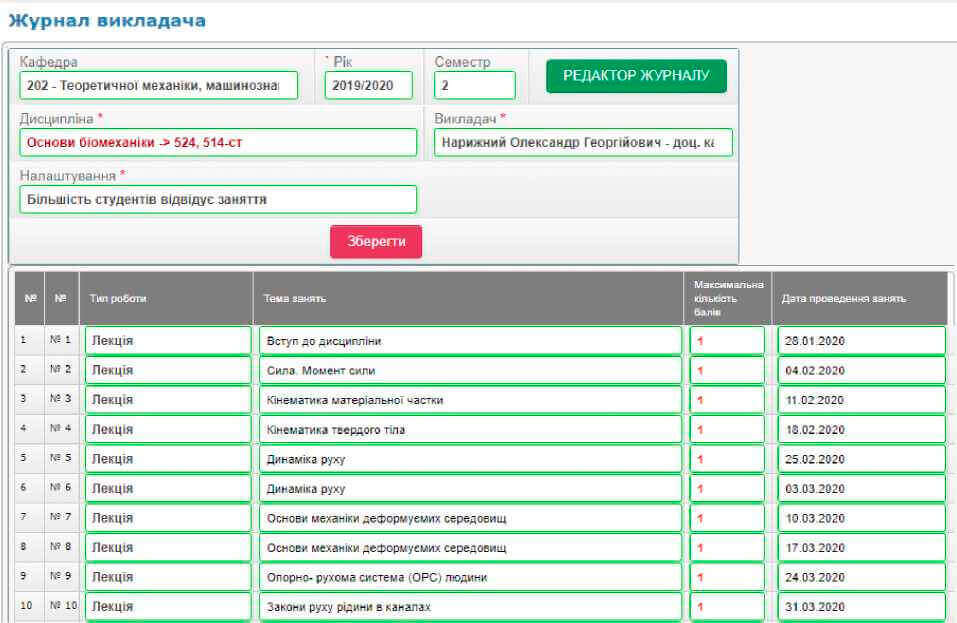 За дисципліною автоматично зафіксовано певну кількість пар відповідно до плану. За бажанням викладач може внести теми занять, задати максимальну кількість балів, які студент може отримати на парі.