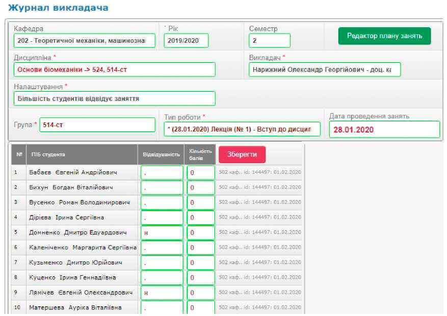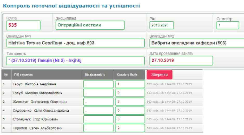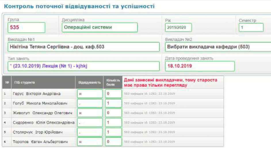 На кожній парі викладач проставляє відвідуваність і бали. Внесення відвідуваності і балів за активність на лекційному занятті. Внесення відвідуваності і балів за лабораторну роботу.