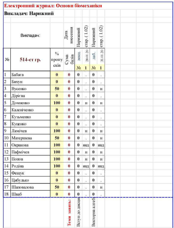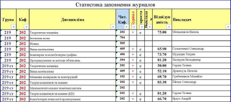 Викладач може вивантажити електронний варіант журналу, де автоматично розрахований % пропуску занять, сума балів.