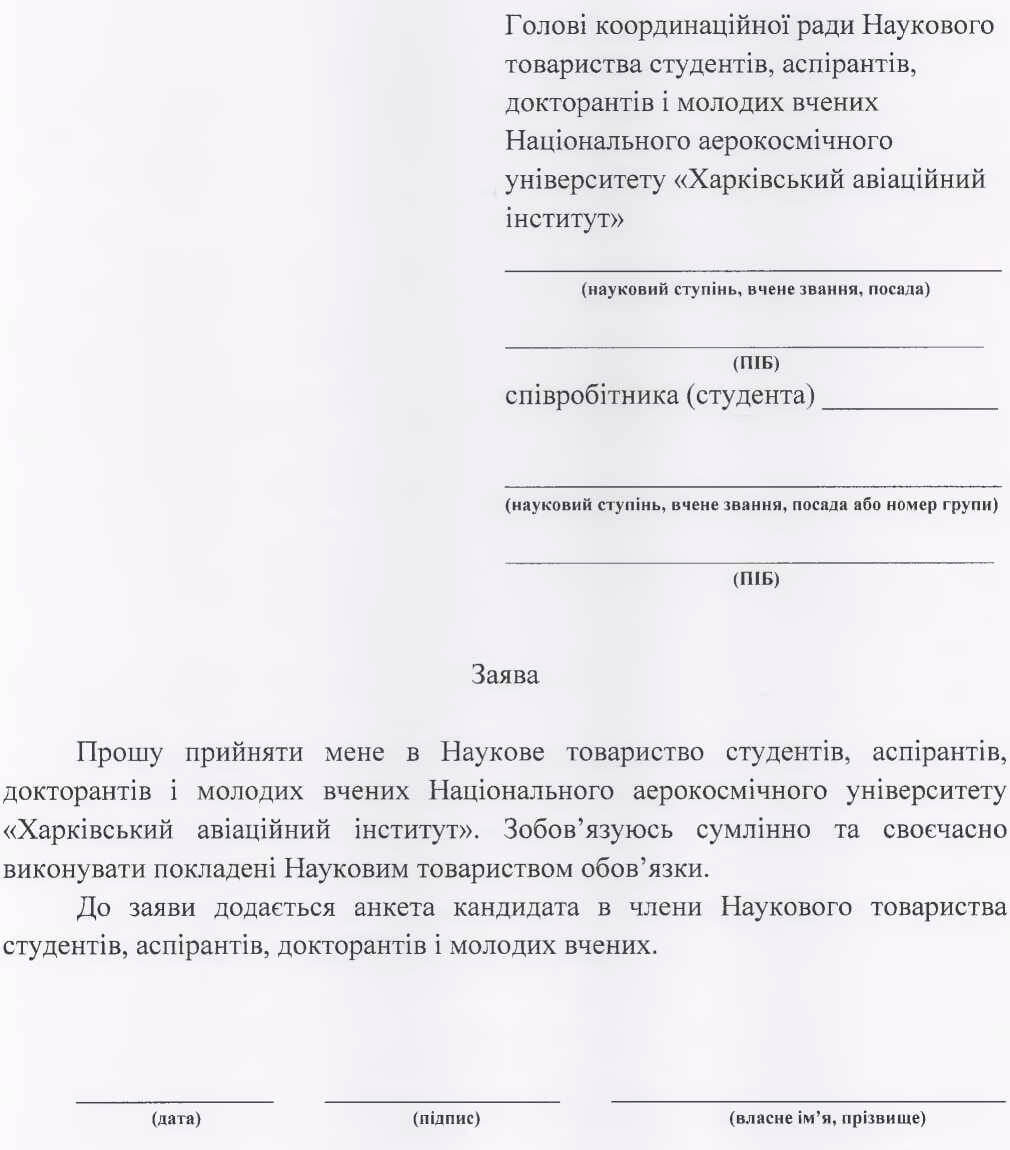 Зразок заяви кандидата в члени наукового товариства студентів, аспірантів, докторантів і молодих вчених