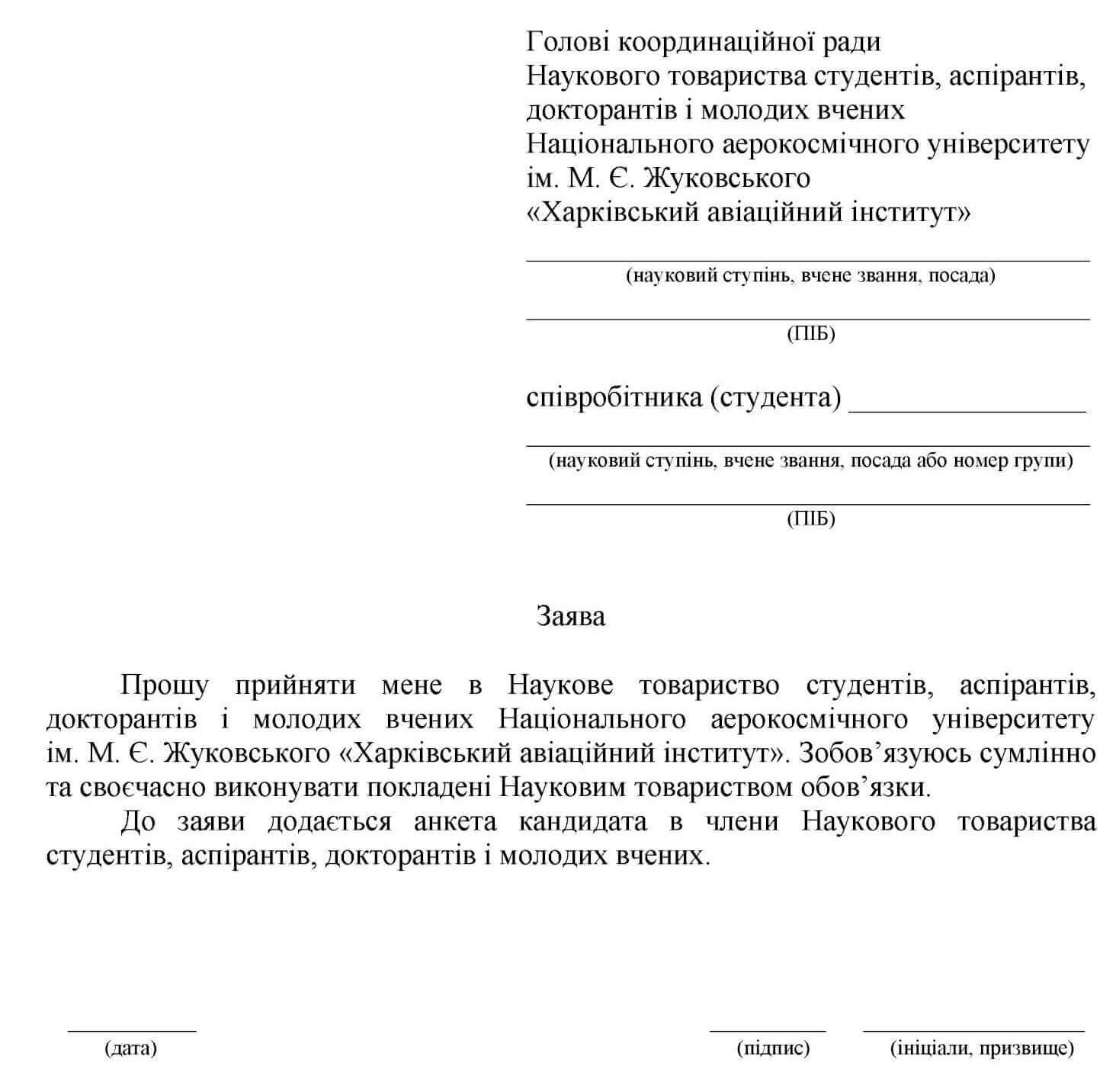 Зразок заяви кандидата в члени