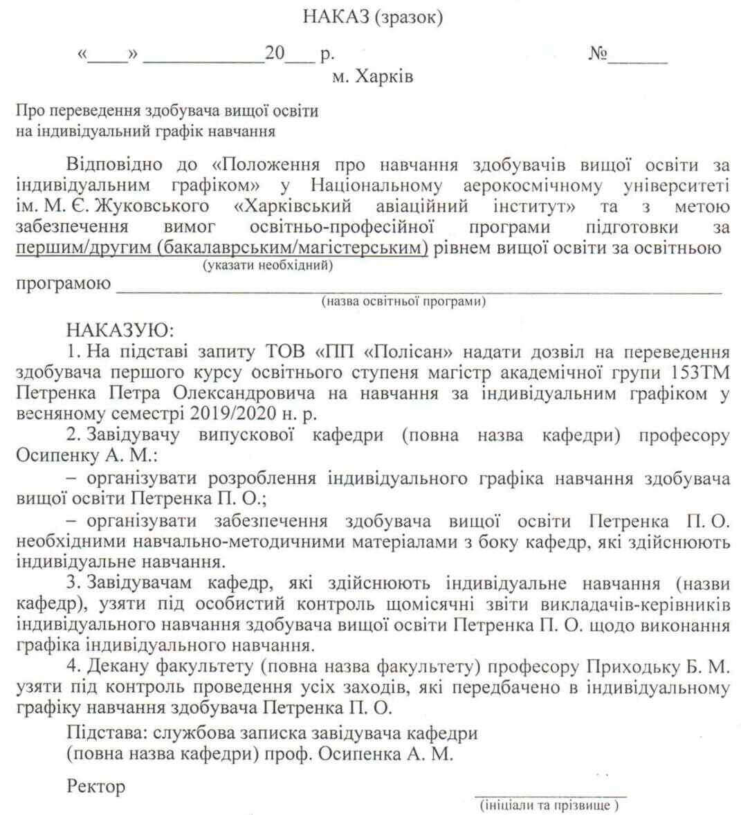 3.5 Після підписання ректором наказу за п. 3.4 декан ознайомлює з ним заступника з навчальної роботи, а останній - завідувачів кафедр, які організують навчання здобувана вищої освіти за індивідуальним графіком, старосту академічної групи й самого здобувана вищої освіти під підпис.