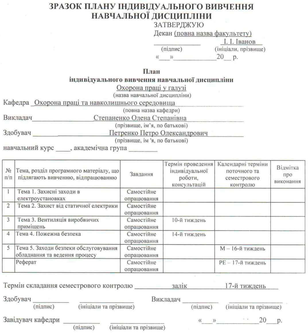 3) план індивідуального вивчення навчальної дисципліни (Додаток В) - документ, що визначає порядок самостійного опрацювання під контролем і за допомогою викладачів розділів навчальної дисципліни, яка вивчається за індивідуальним графіком та містить інформацію щодо організації індивідуальної роботи за змістовними модулями та календарні терміни поточного й семестрового контролю з відмітками про виконання;