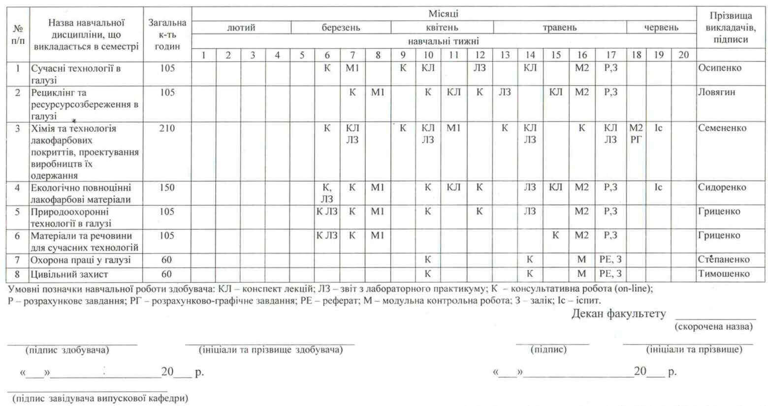 4.4 До індивідуального графіку навчання включаються усі навчальні дисципліни семестрового плану й індивідуальні завдання (курсові роботи, курсові проекти, реферати та інші види робіт), які здобувач вищої освіти має виконати, а також форми поточного й підсумкового контролю та терміни звітності. Графік підписують здобувач вищої освіти та декан факультету, затверджує проректор з науково-педагогічної роботи.