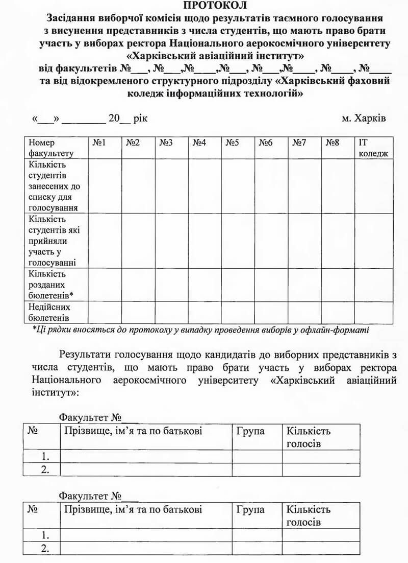 3.6.16. Перший примірник протоколу про результати голосування залишається Комісії. Другий примірник протоколу передається організаційному комітету з проведення виборів ректора Університету.