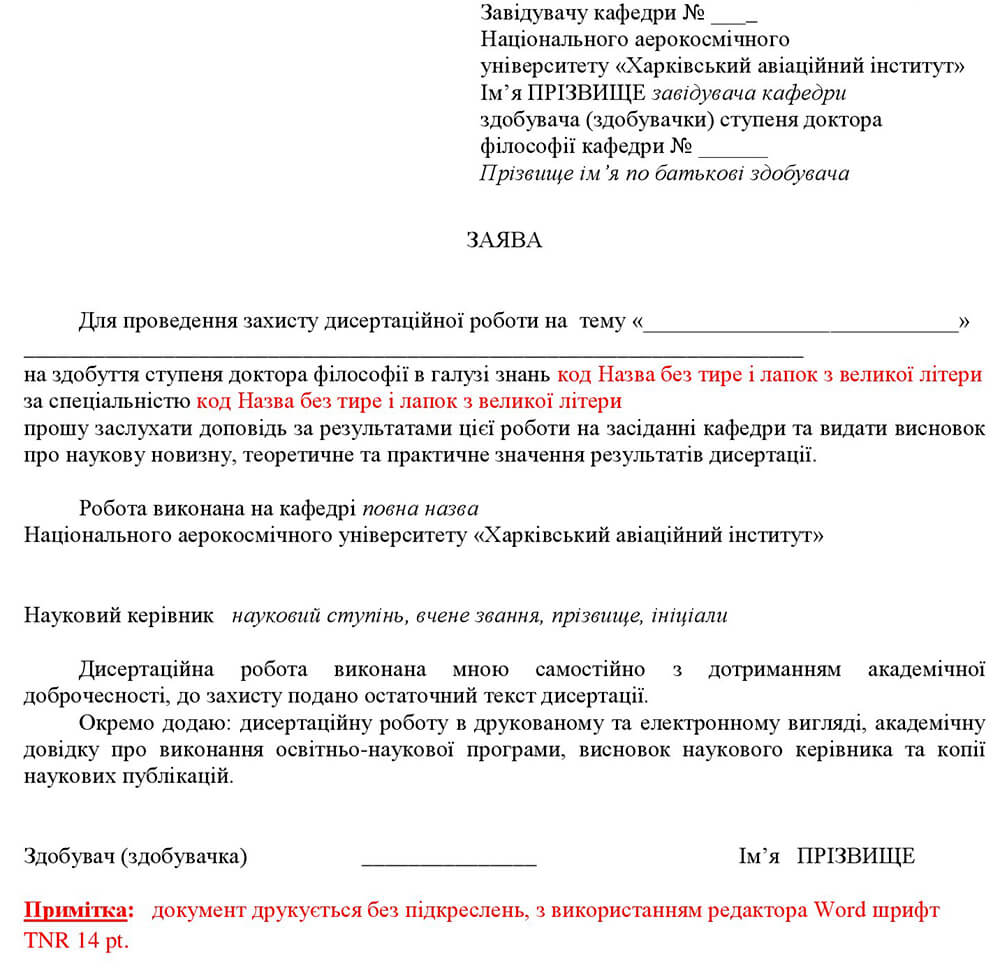 2) звертається до завідувача кафедри, що виконує відповідну освітньо-наукову програму та здійснює підготовку Здобувача, з письмовою заявою про отримання висновку про наукову новизну, теоретичне та практичне значення результатів дисертації (Додаток 2. Зразок 1).