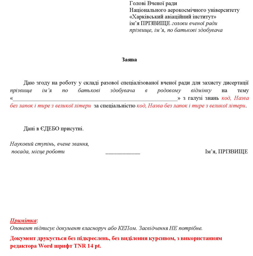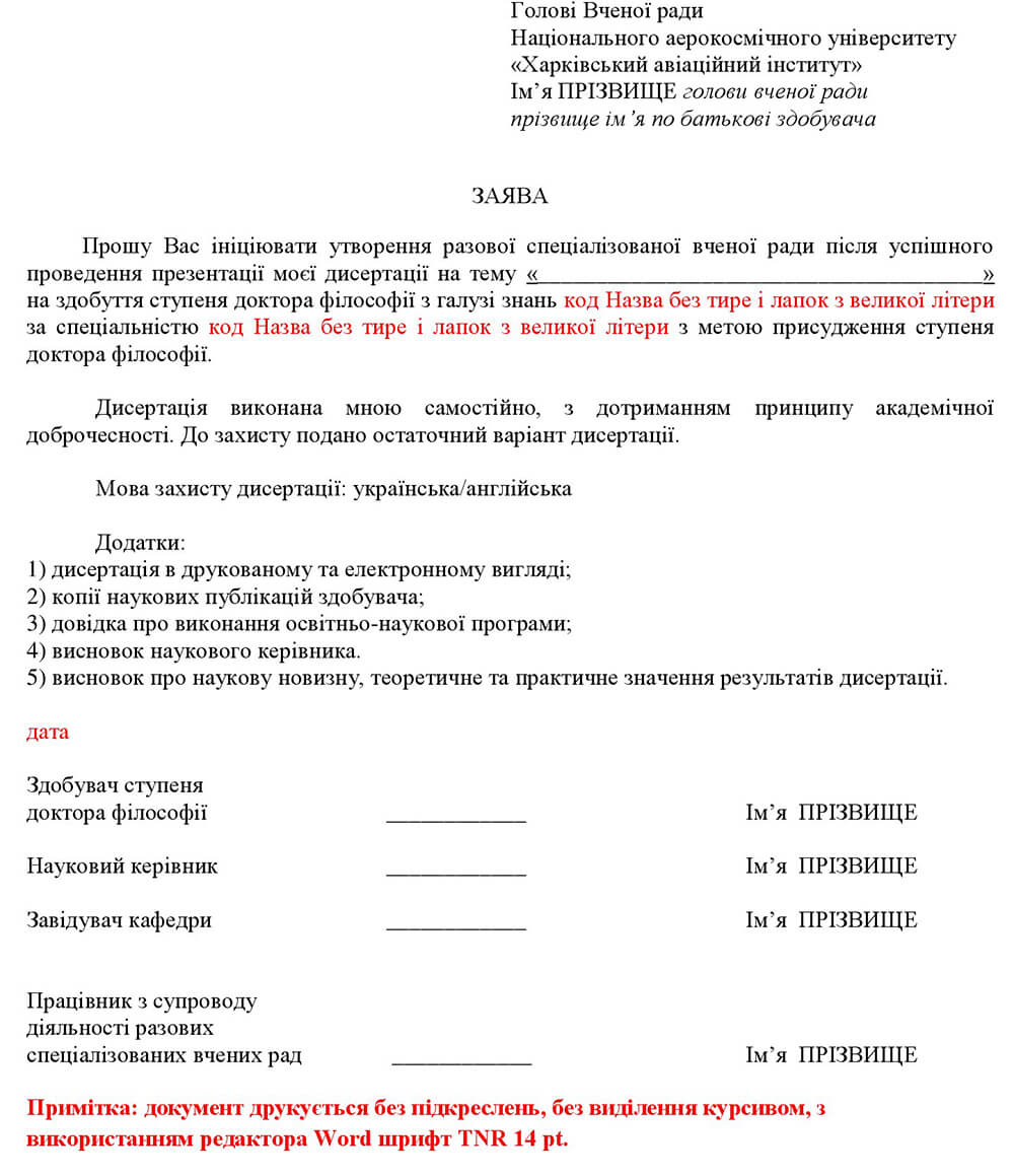 4.1. За наявності позитивного висновку про наукову новизну, теоретичне та практичне значення результатів дисертації Здобувач звертається до вченої ради Університету з письмовою заявою про утворення разової ради не пізніше ніж протягом двох тижнів з дня отримання зазначеного висновку (Додаток 2. Зразок 2).