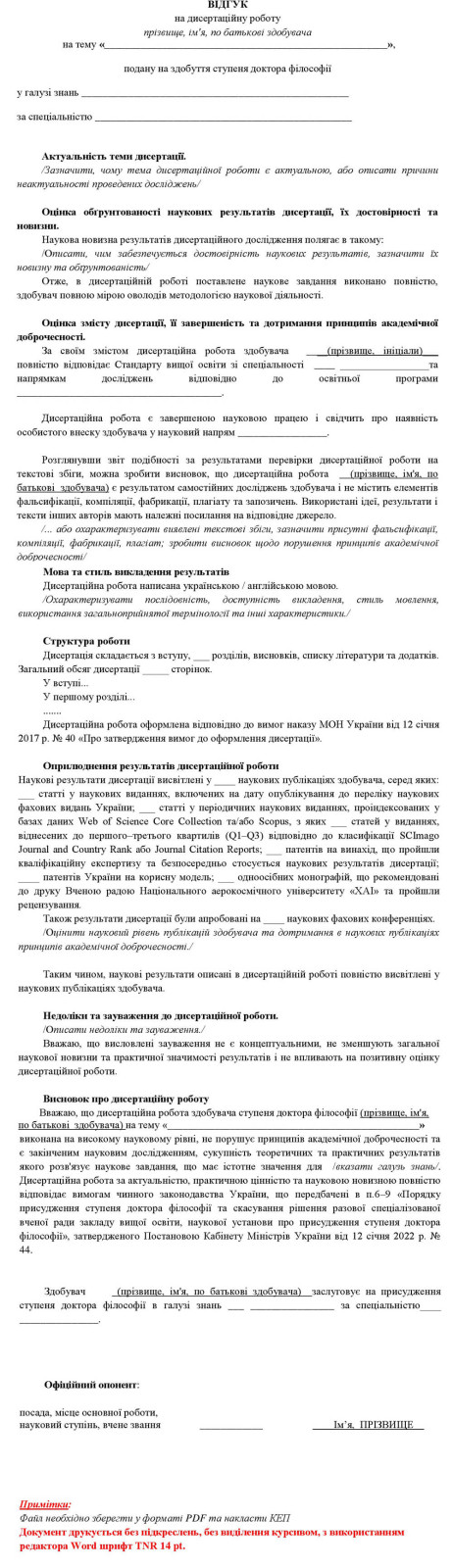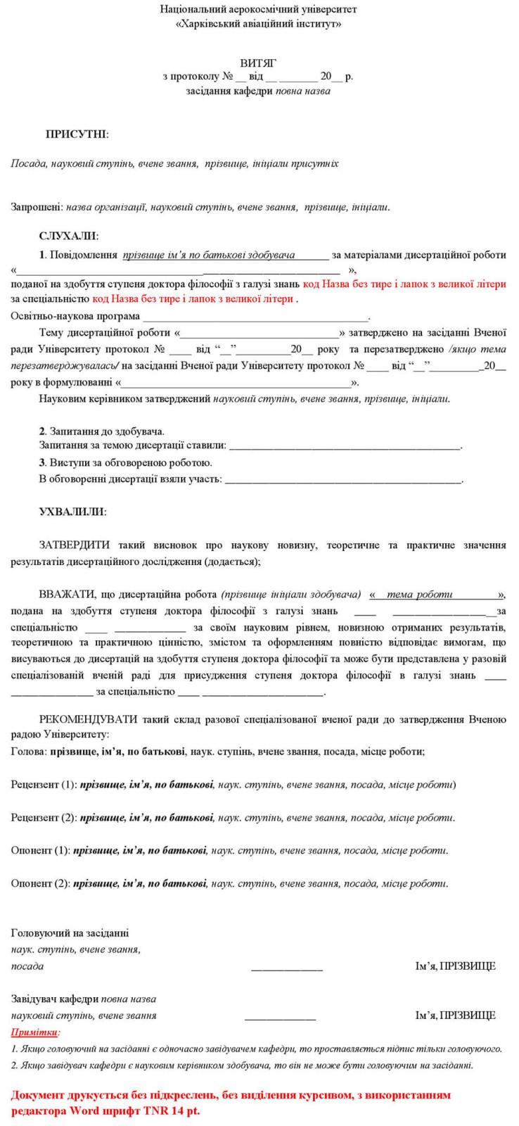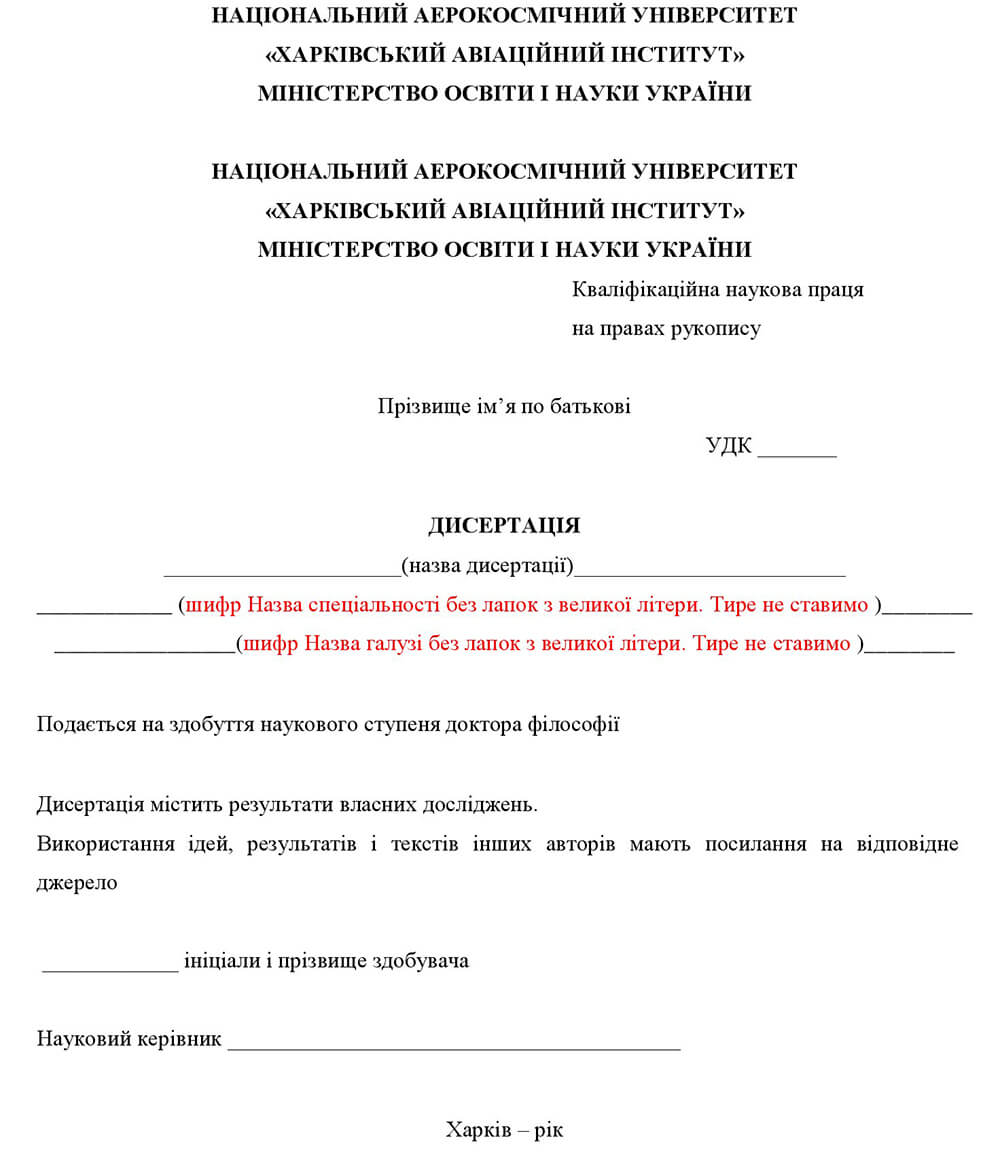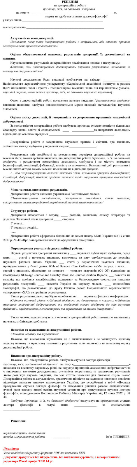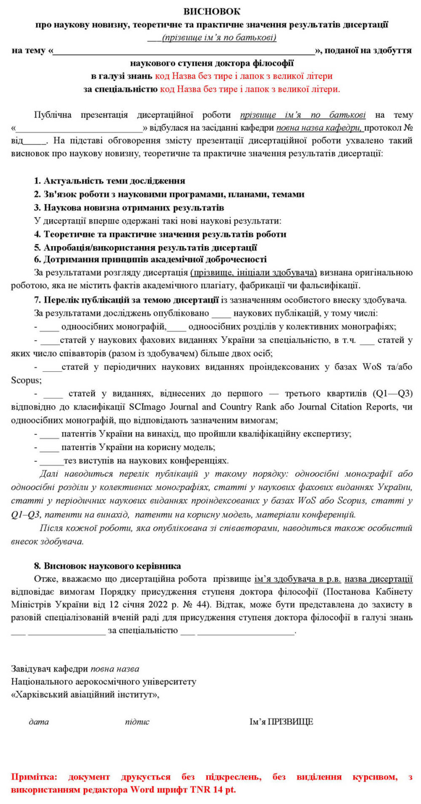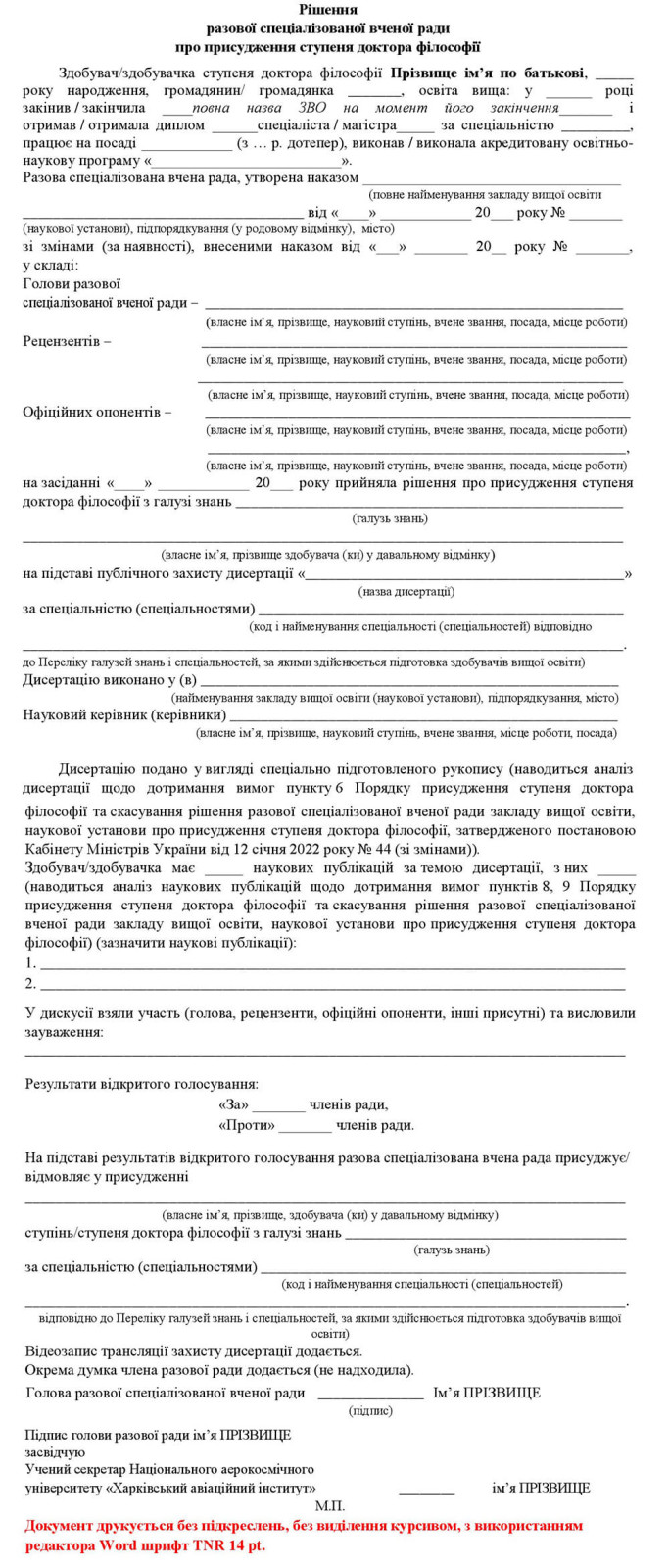 1.1. Це положення про порядок присудження ступеня доктора філософії та проходження процедури захисту дисертації на здобуття ступеня доктора філософії у Національному аерокосмічному університеті «Харківський авіаційний інститут» (далі – Положення) розроблено на підставі Закону України «Про вищу освіту» від 01.07.2014 р. № 1556-VII, Порядку підготовки здобувачів вищої освіти ступеня доктора філософії та доктора наук у закладах вищої освіти (наукових установах), затвердженого постановою Кабінету Міністрів України від 23.03.2016 № 261 в редакції постанови Кабінету Міністрів України від 19 травня 2023 р. № 502, Порядку присудження ступеня доктора філософії та скасування рішення разової спеціалізованої вченої ради закладу вищої освіти, наукової установи про присудження ступеня доктора філософії», затвердженого постановою Кабінету Міністрів України від 12.01.2022 № 44 в редакції від 08.05.2024 (далі – Порядок), Порядку функціонування інформаційної системи Національного агентства із забезпечення якості вищої освіти (далі НАЗЯВО) «NAQA.Svr», затвердженого НАЗЯВО, протокол від 30 серпня 2022 року № 13 (18) зі змінами (протокол від 19 листопада 2024 року № 19 (69), протокол від 22 квітня 2025 року № 6 (78), «Порядку державного обліку НТР та дисертацій. Роз'яснення щодо державної реєстрації та обліку відкритих науково-дослідних, дослідно-конструкторських робіт / Державна наукова установа «Український інститут наукової експертизи та інформації», постанови Кабінету Міністрів України «Про внесення змін до деяких постанов Кабінету Міністрів України з питань підготовки та атестації здобувачів наукових ступенів» від 19.05.2023 № 502, постанови Кабінету Міністрів України «Про внесення змін до деяких постанов Кабінету Міністрів України з питань підготовки та атестації науково-педагогічних і наукових кадрів» № 507 від 03.05.2024, листа-роз’яснення щодо застосування кваліфікованих електронних підписів при створенні разових рад Національного агентства із забезпечення якості вищої освіти від 07.07.2023 № 918.