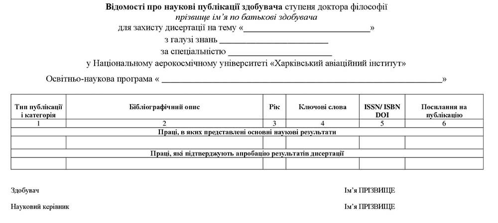 До заяви додаються: дисертація в друкованому вигляді та електронній формі, наукові публікації (або їх копії), в яких висвітлено наукові результати дисертації, довідка про виконання освітньо-наукової програми та висновок наукового керівника (керівників).