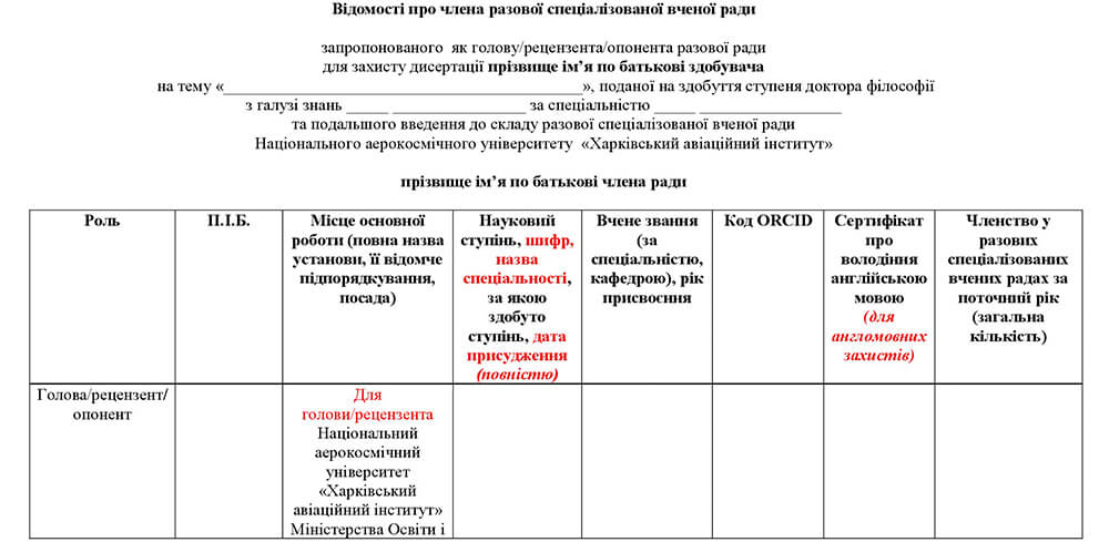 | 2. | Подання в установленому порядку на розгляд вченої ради Університету документів щодо утворення разової ради | 1. Заява Здобувача щодо утворення разової ради 2. Службова записка завідувача кафедри, на якій проходить підготовку Здобувач, з пропозиціями щодо складу разової ради 3. Дисертація (друкований та електронний примірник з КЕП) 4. Копії публікацій за результатами дисертаційного дослідження 5. Зведені бібліографічні дані щодо публікацій Здобувача 6. Довідка про виконання ОНП 7. Висновок наукового керівника /керівників 8. Висновок про наукову новизну, теоретичне та практичне значення результатів дослідження 9. Розписка Здобувача про дотримання вимог законодавства України щодо питань державної таємниці та службової інформації 10. Згоди опонентів на участь у роботі разової ради (заява та відомості про себе і свої наукові публікації, а також копії документів на підтвердження наукового ступеня і наукового звання) 11. Відомості про голову і рецензентів у складі разової ради 12. Довідка з бібліотеки Університету про наукові публікації (за науковим напрямом, за яким підготовлено дисертацію) голови, рецензентів та офіційних опонентів 13. Довідка з бібліотеки Університету про наукові публікації Здобувача 14. Зведена інформація про дисертацію, наукові публікації та склад разової ради |