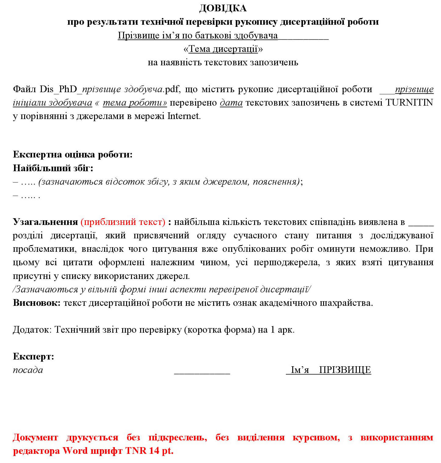| 4. | Оприлюднення на офіційному вебсайті Університету дисертації, висновку про наукову новизну, теоретичне та практичне значення результатів дисертації, інформації про склад разової ради, посилання на трансляцію захисту, внесення інформації до ІС НАЗЯВО, реєстрація дисертації в УкрІНТЕІ, передача друкованого та електронного примірника дисертації до бібліотеки Університету, (впродовж п’яти робочих днів від дати наказу ректора про створення разової ради). Отримання довідки про результати перевірки дисертації на плагіат (збіг з Інтернет-джерелами). | 1. Облікова картка дисертації в УкрІНТЕІ. 2. Довідка, що підтверджує факт передавання друкованого та електронного примірника дисертації, підписаного Здобувачем з КЕП, до бібліотеки Університету 3. Довідка про результати перевірки дисертації на плагіат (збіг з Інтернет-джерелами) 4. Посилання на трансляцію захисту |