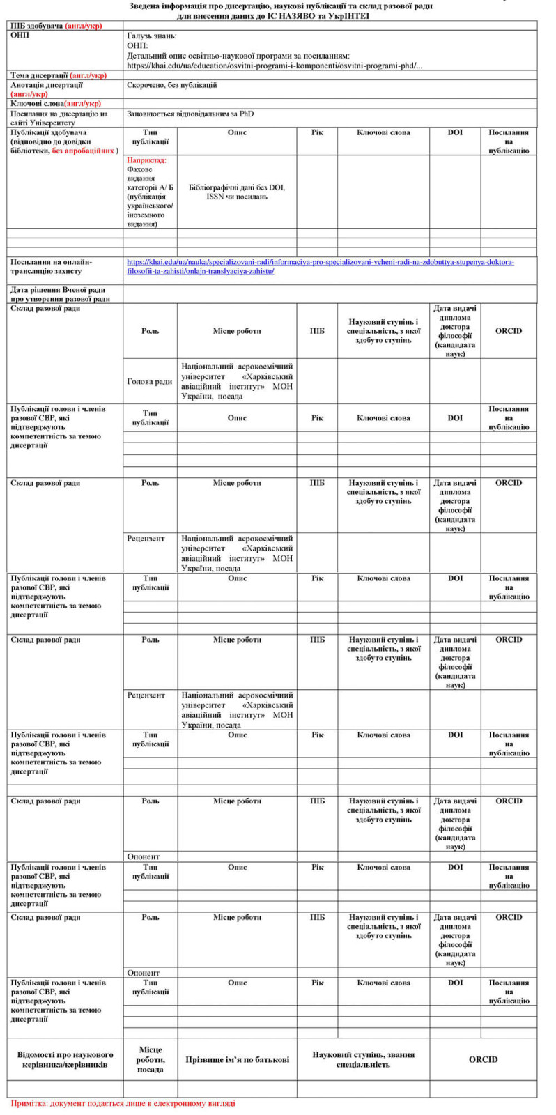- зведена інформація про дисертацію, наукові публікації та склад разової ради, сформованої відповідно до п. 4.4 цього Положення, для внесення даних до ІС НАЗЯВО та УкрІНТЕІ (Додаток 2. Зразок 8).
