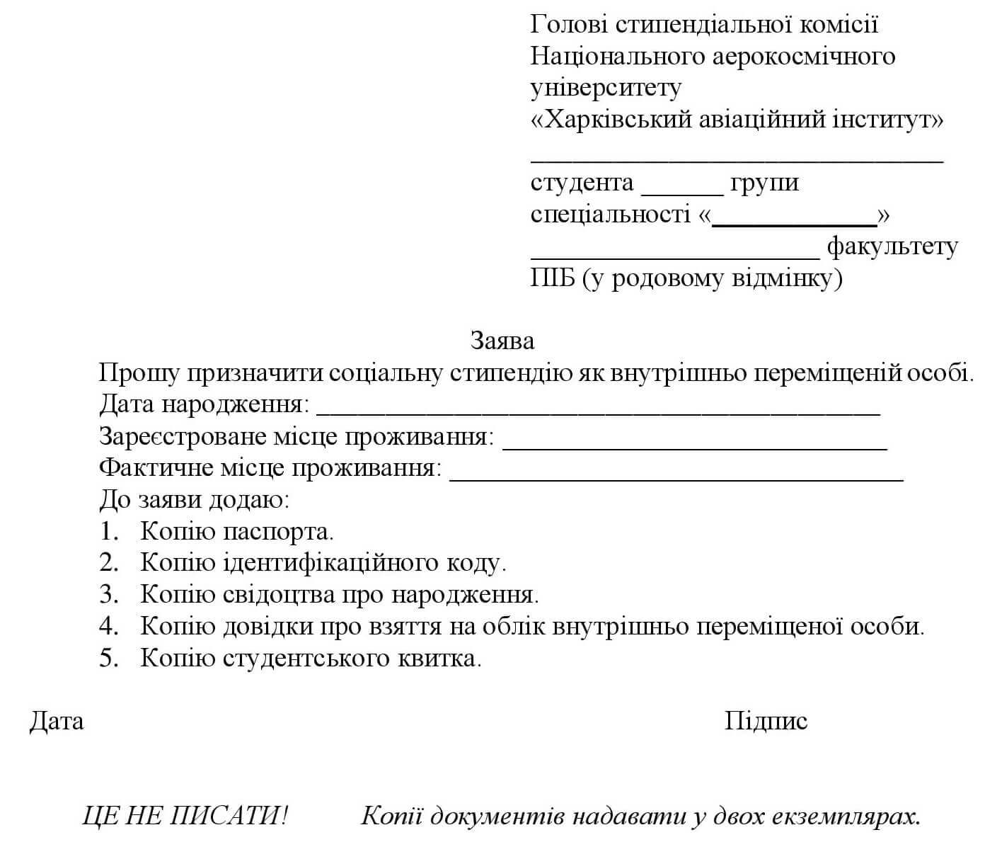 1.2. Дія цього Положення поширюється на осіб, які навчаються в Національному аерокосмічному університеті «Харківський авіаційний інститут» (далі – Університет) за рахунок коштів загального фонду державного бюджету: здобувачів фахової передвищої, вищої освіти денної форми здобуття освіти (крім осіб, які навчаються за спеціальностями галузі знань «Державне управління» або спеціальністю «Публічне управління та адміністрування» за замовленням НАДС); аспірантів і докторантів, які навчаються з відривом від виробництва.