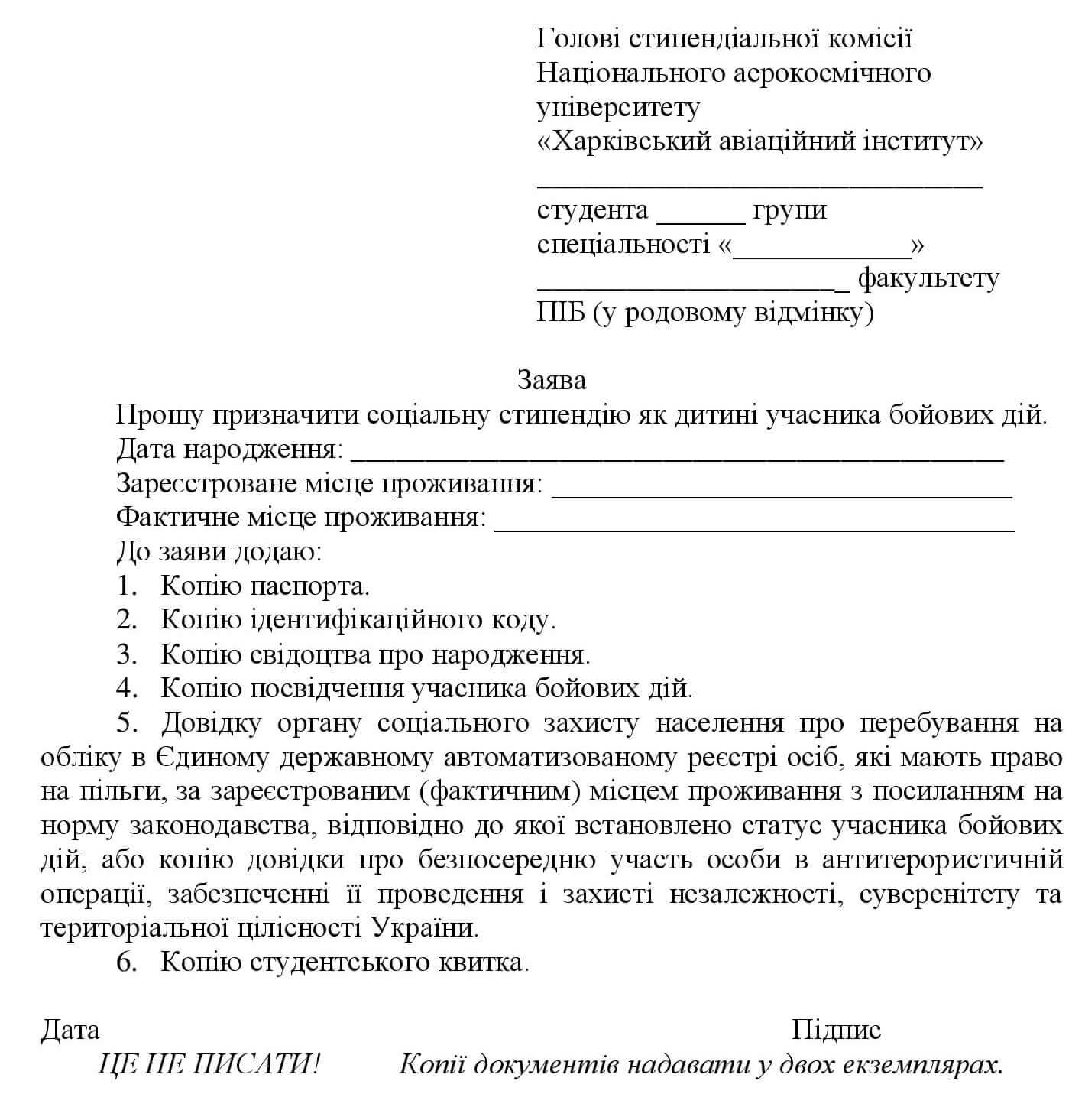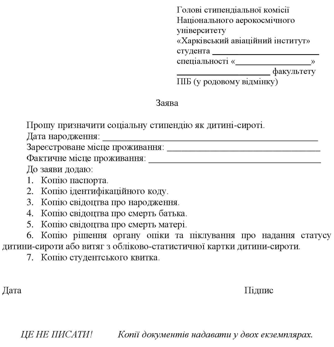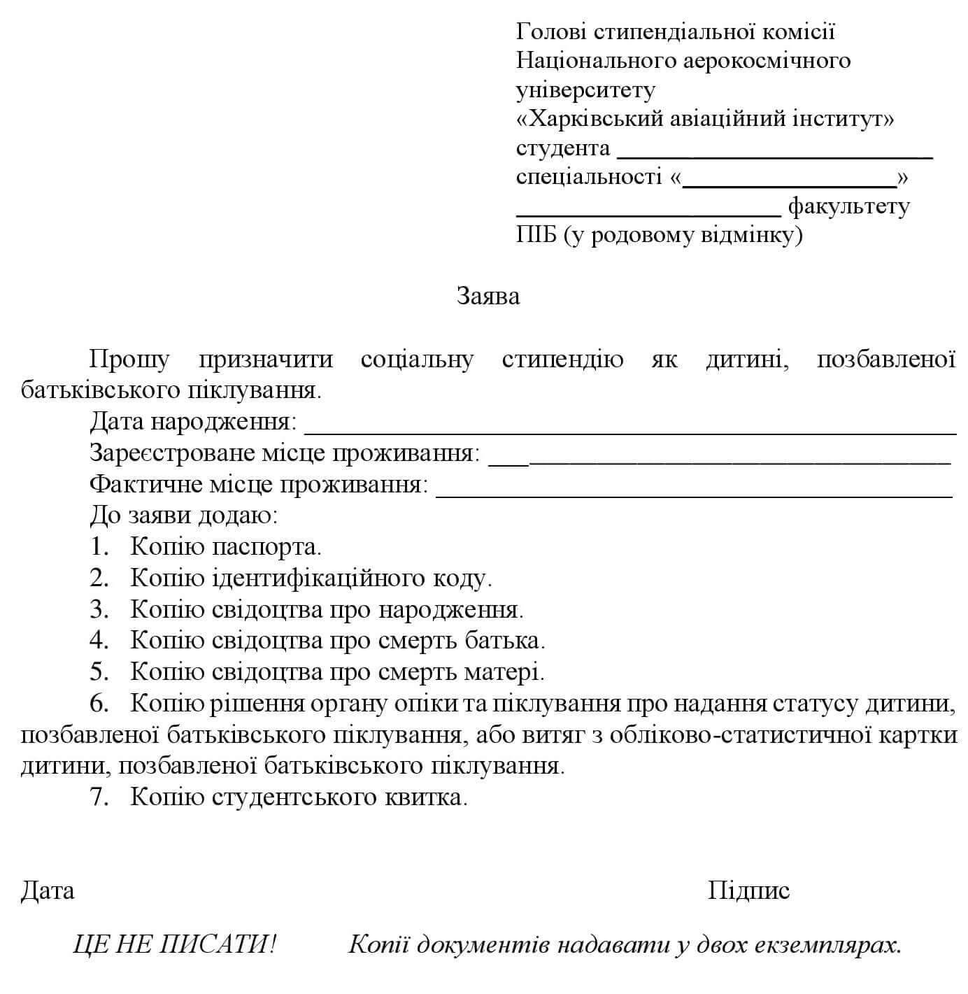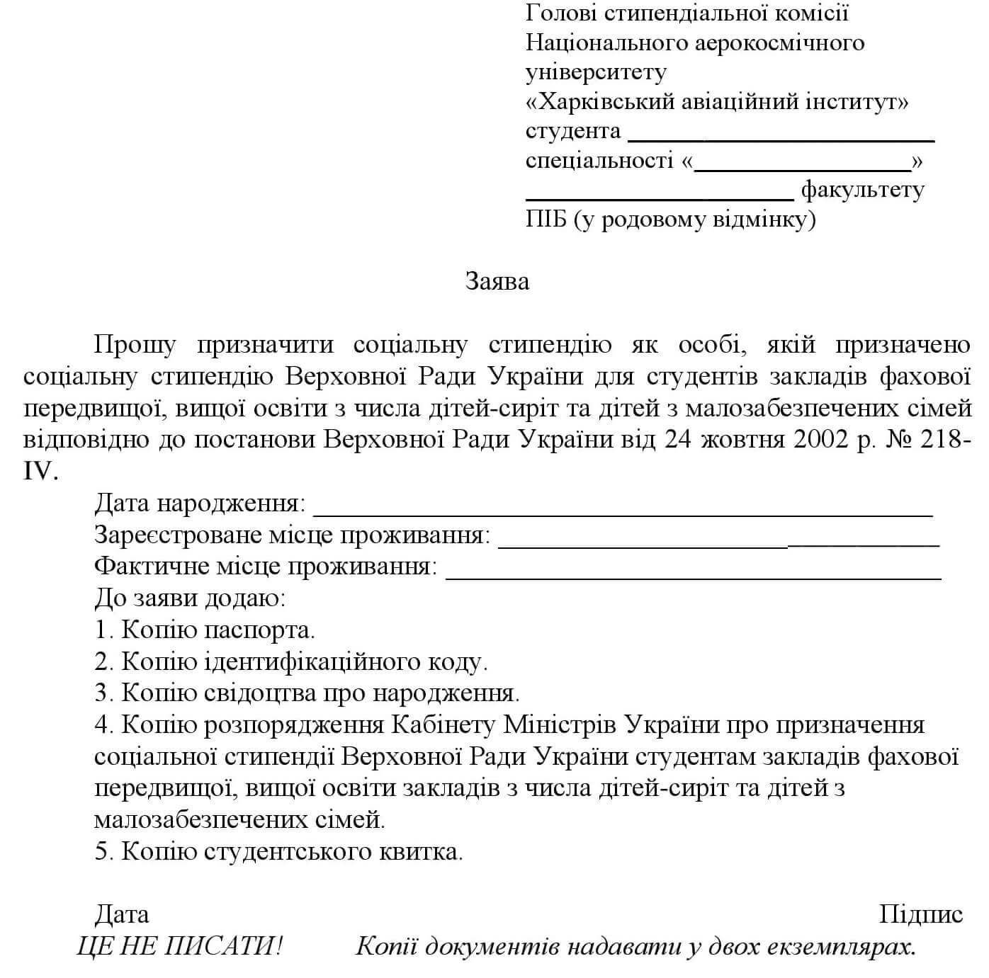 Б.14 Форма заяви для особи, яка є особою, якій призначено соціальну стипендію Верховної Ради України для студентів закладів фахової передвищої, вищої освіти з числа дітей-сиріт та дітей з малозабезпечених сімей відповідно до постанови Верховної Ради України від 24 жовтня 2002 року № 218-IV у такому вигляді: