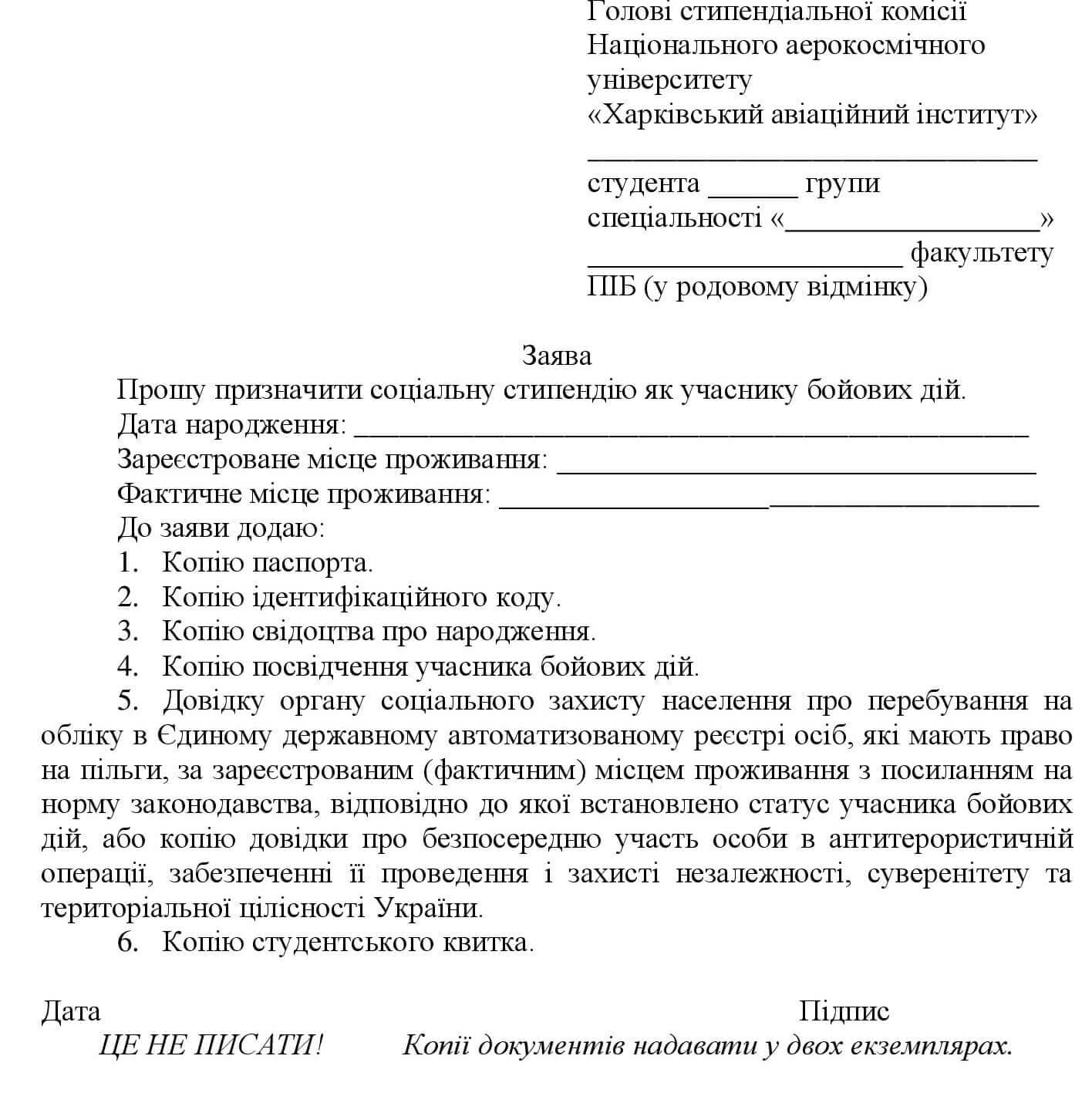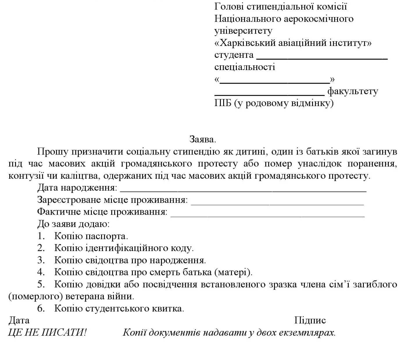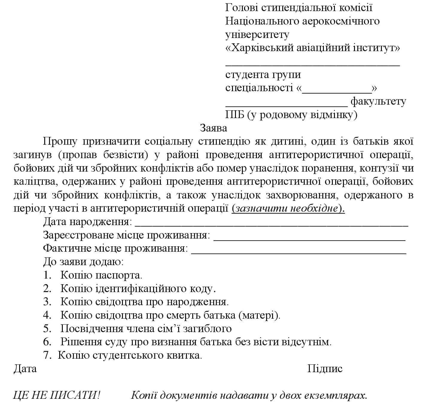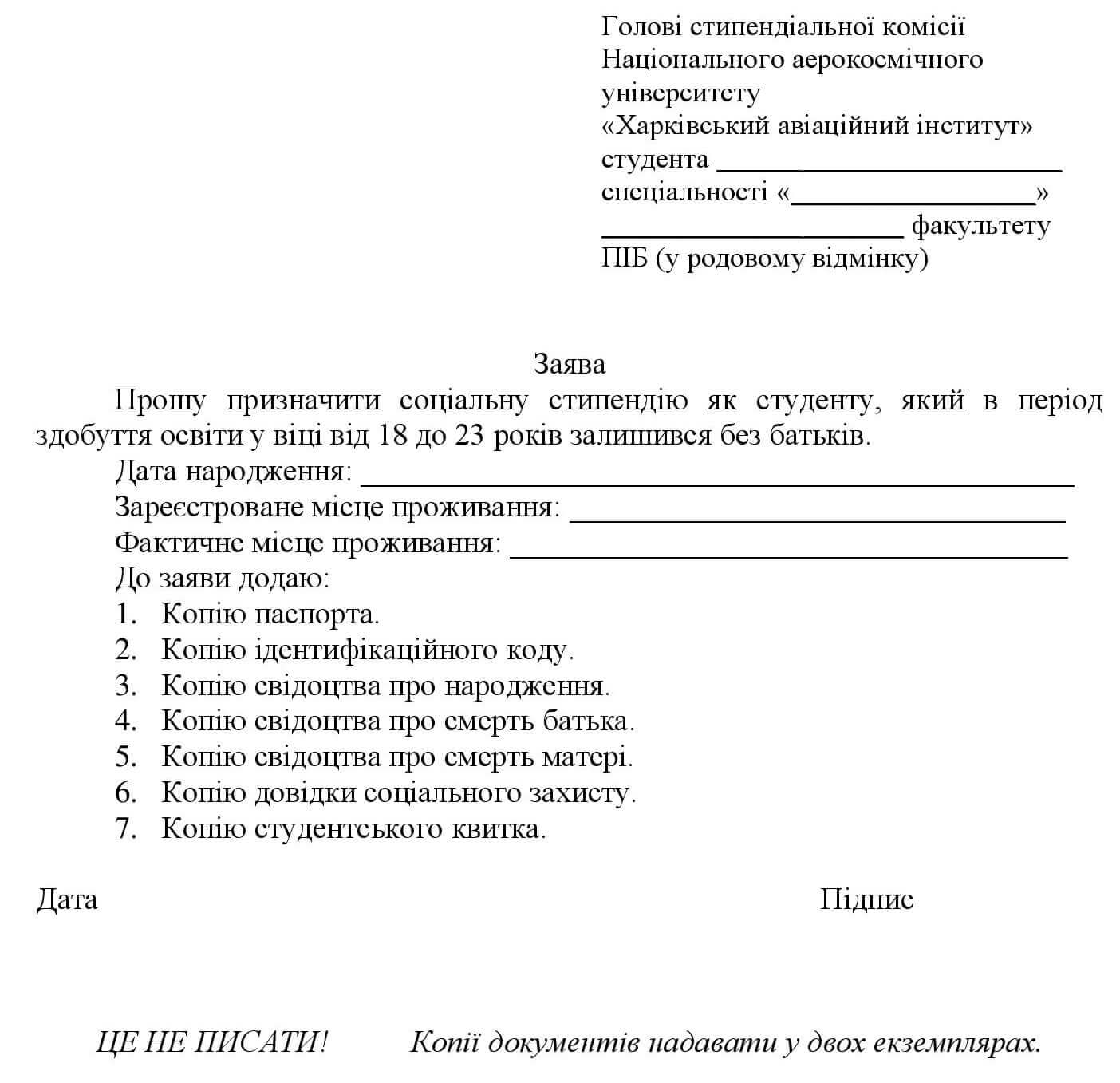 Б.14 Форма заяви для особи, яка є особою, якій призначено соціальну стипендію Верховної Ради України для студентів закладів фахової передвищої, вищої освіти з числа дітей-сиріт та дітей з малозабезпечених сімей відповідно до постанови Верховної Ради України від 24 жовтня 2002 року № 218-IV у такому вигляді: