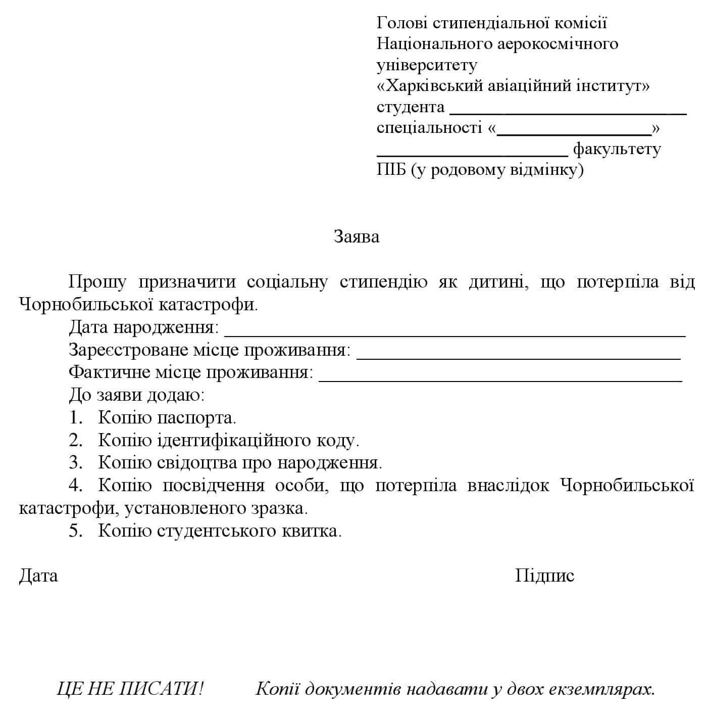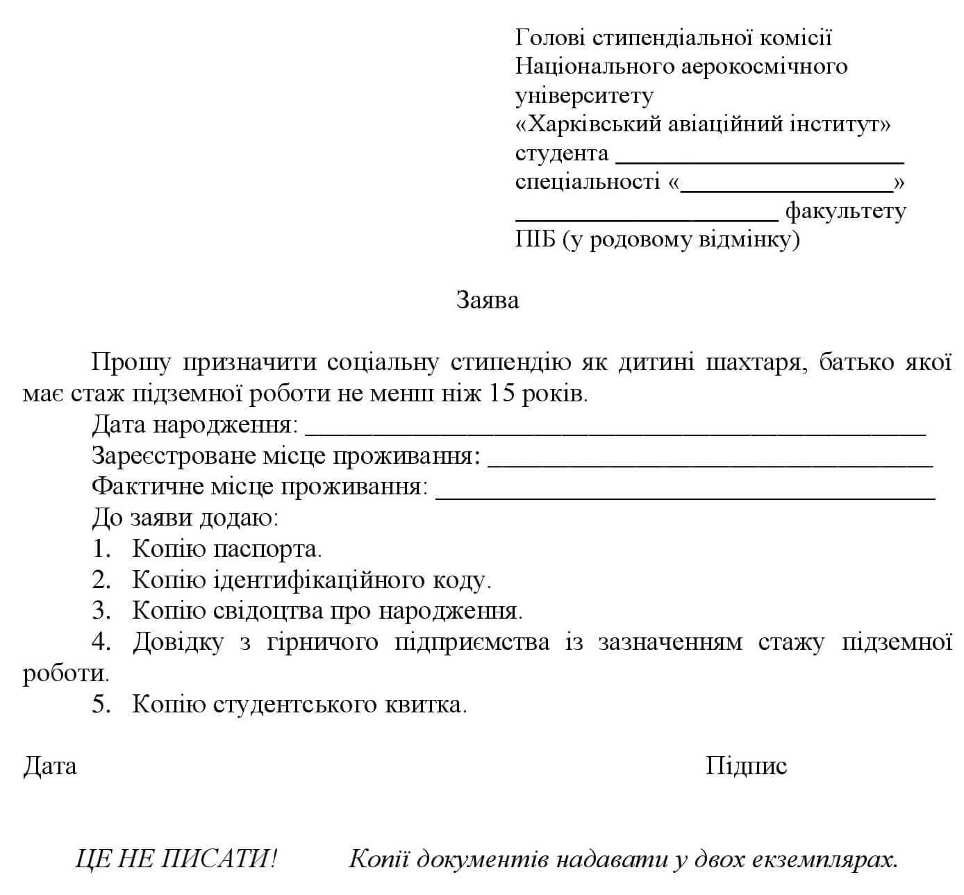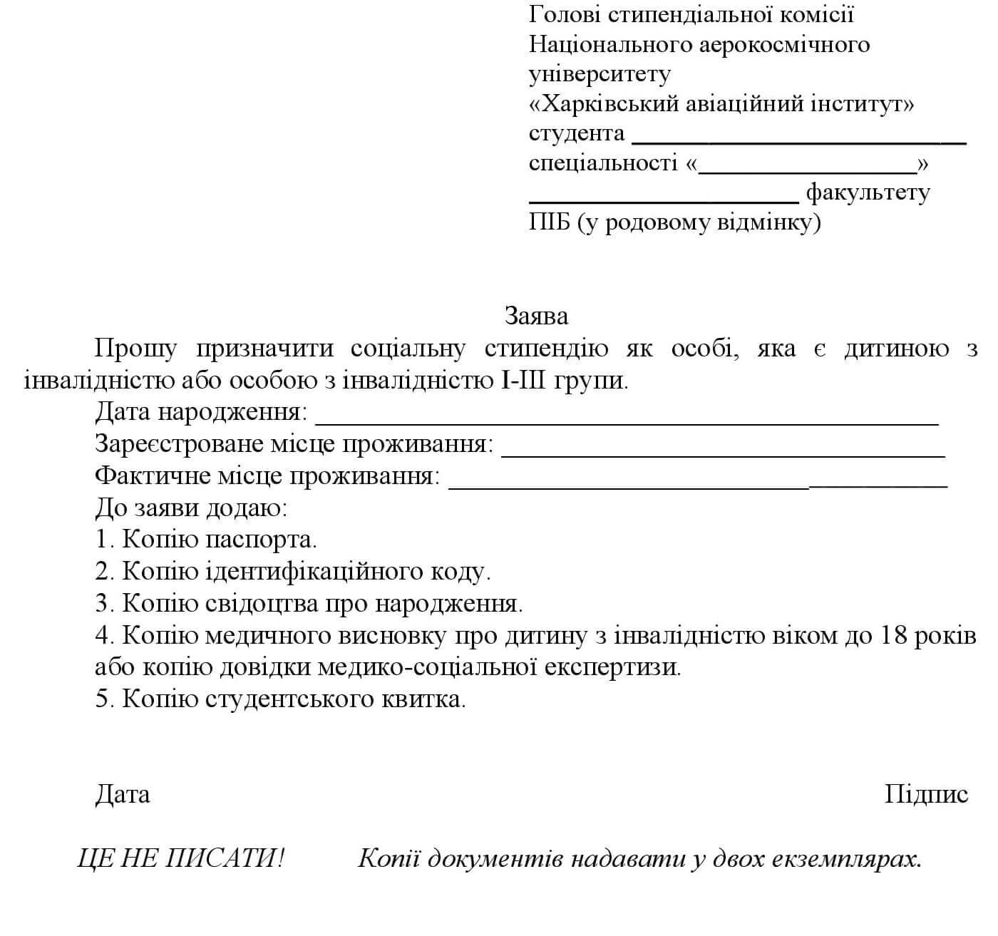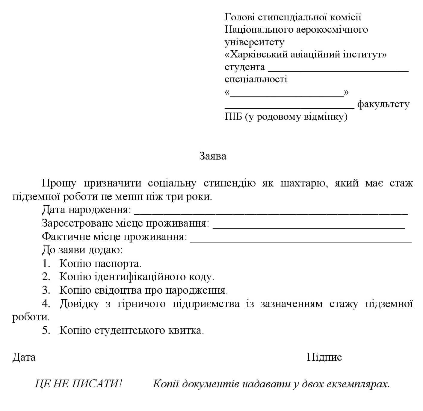 Б.14 Форма заяви для особи, яка є особою, якій призначено соціальну стипендію Верховної Ради України для студентів закладів фахової передвищої, вищої освіти з числа дітей-сиріт та дітей з малозабезпечених сімей відповідно до постанови Верховної Ради України від 24 жовтня 2002 року № 218-IV у такому вигляді: