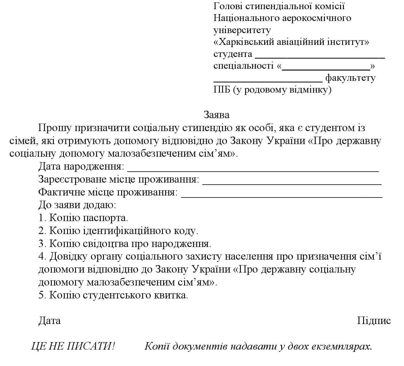 Б.16 Форма заяви для особи, яка є студентом із сімей, які отримують допомогу відповідно до Закону України «Про державну соціальну допомогу малозабезпеченим сім’ям» у такому вигляді: