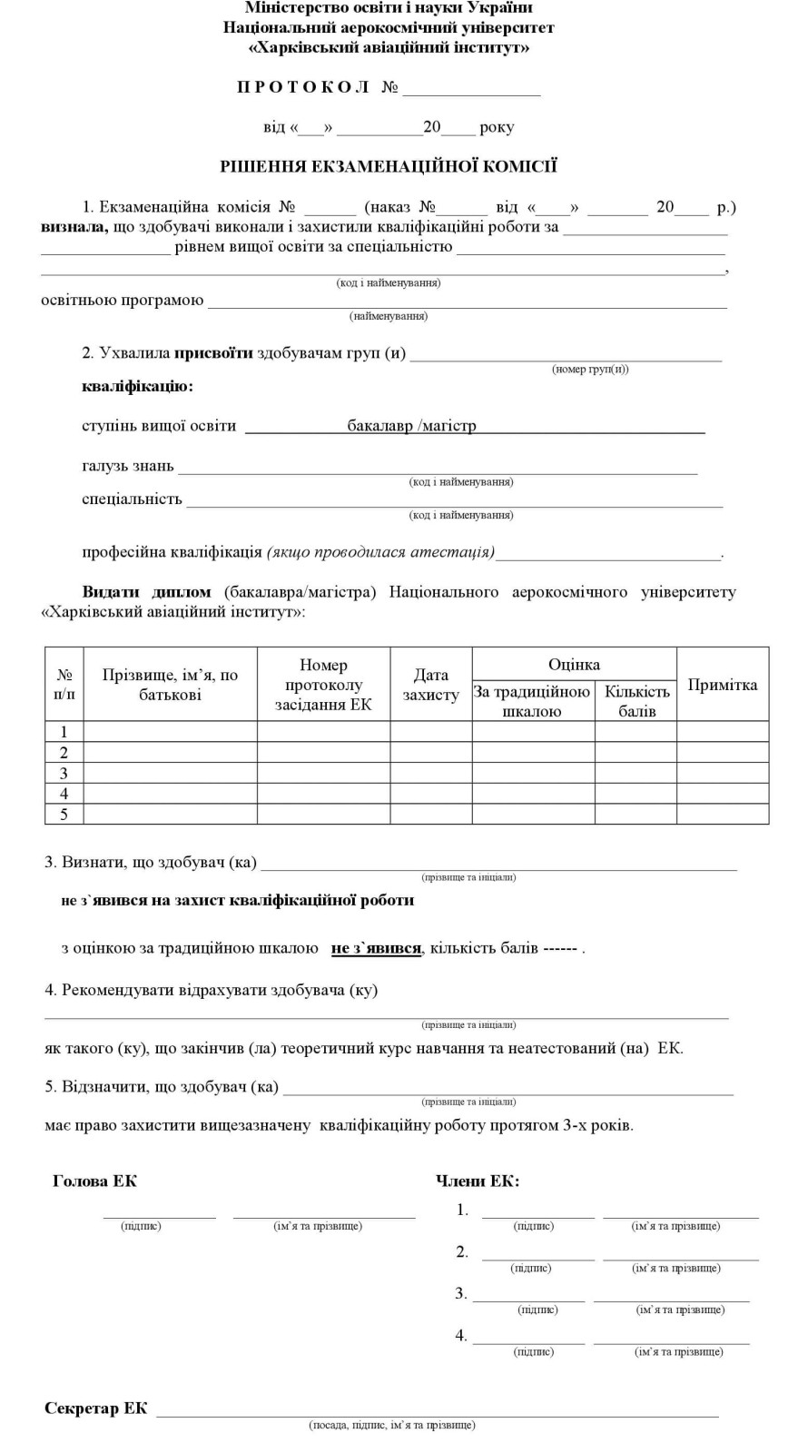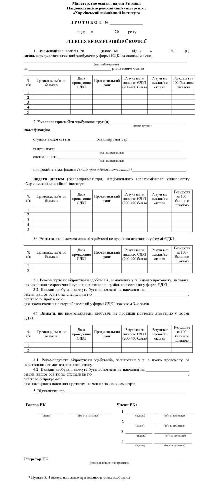 Форми протоколів рішення екзаменаційної комісії