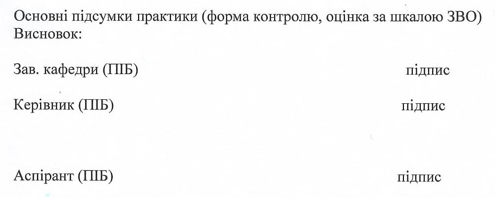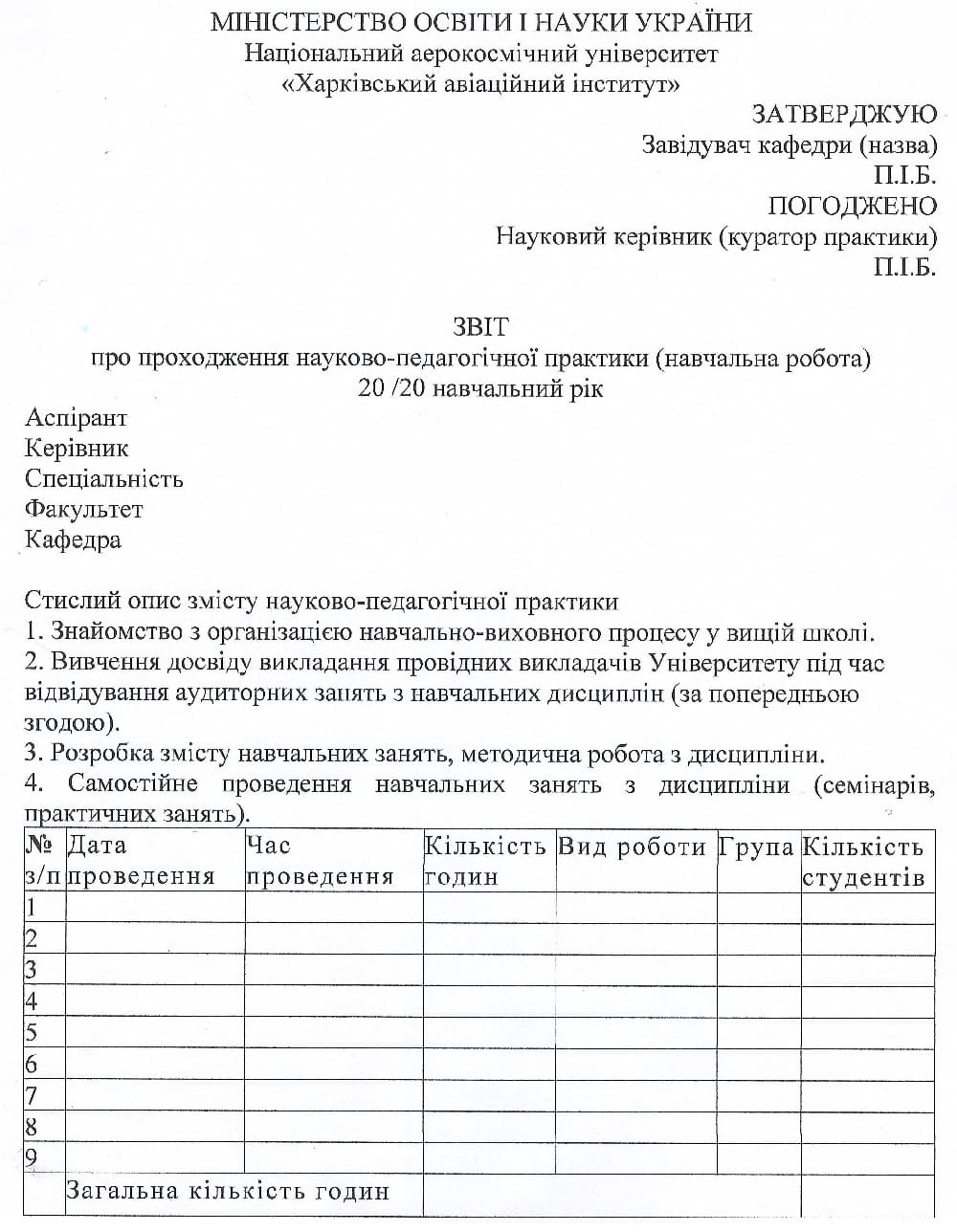 5.1. За підсумками проходження науково-педагогічної практики здобувачі вищої освіти ступеня доктора філософії подають до відділу аспірантури і докторантури звіт за кожним видом робіт педагогічної практики, підписаний завідувачем кафедри, науковим керівником або лектором з дисципліни, за якою відбувалася практика у порядку, визначеному програмою науково-педагогічної практики, українською або іноземною (англійською) мовою залежно від мови навчання та звітують про результати на засіданні кафедри (додаток 1), (додаток 2).