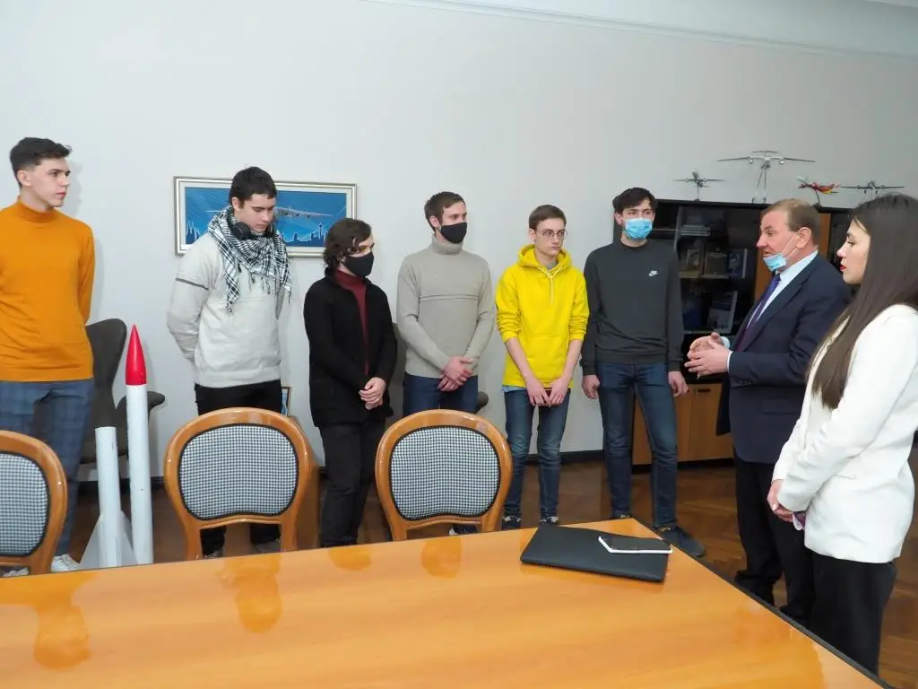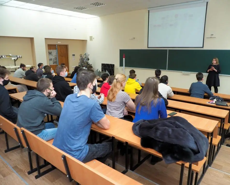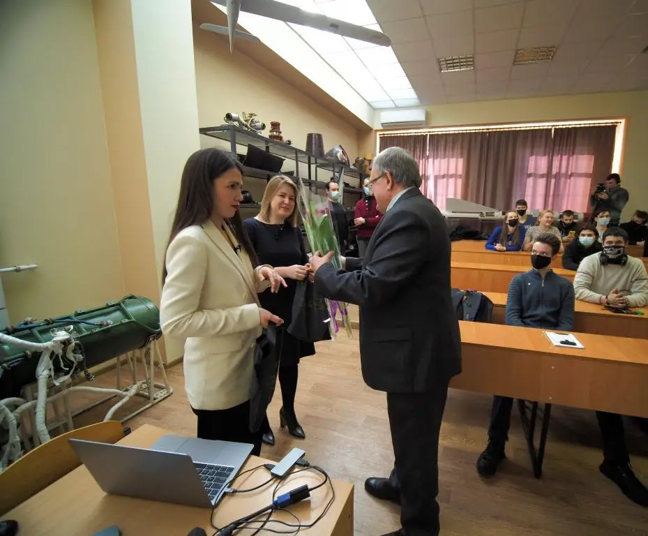 У залі конструкцій бойових ракет і космічних апаратів Альона й Катерина розповіли студентам про своє навчання в ХАІ, провідні сучасні розробки в галузевій промисловості, а також поділилися комерційним досвідом. Наприкінці прозвучали відповіді на запитання, а декан факультету Сергій Губін разом з ентузіастами-ракетомоделістами на знак подяки подарував дівчатам квіти.