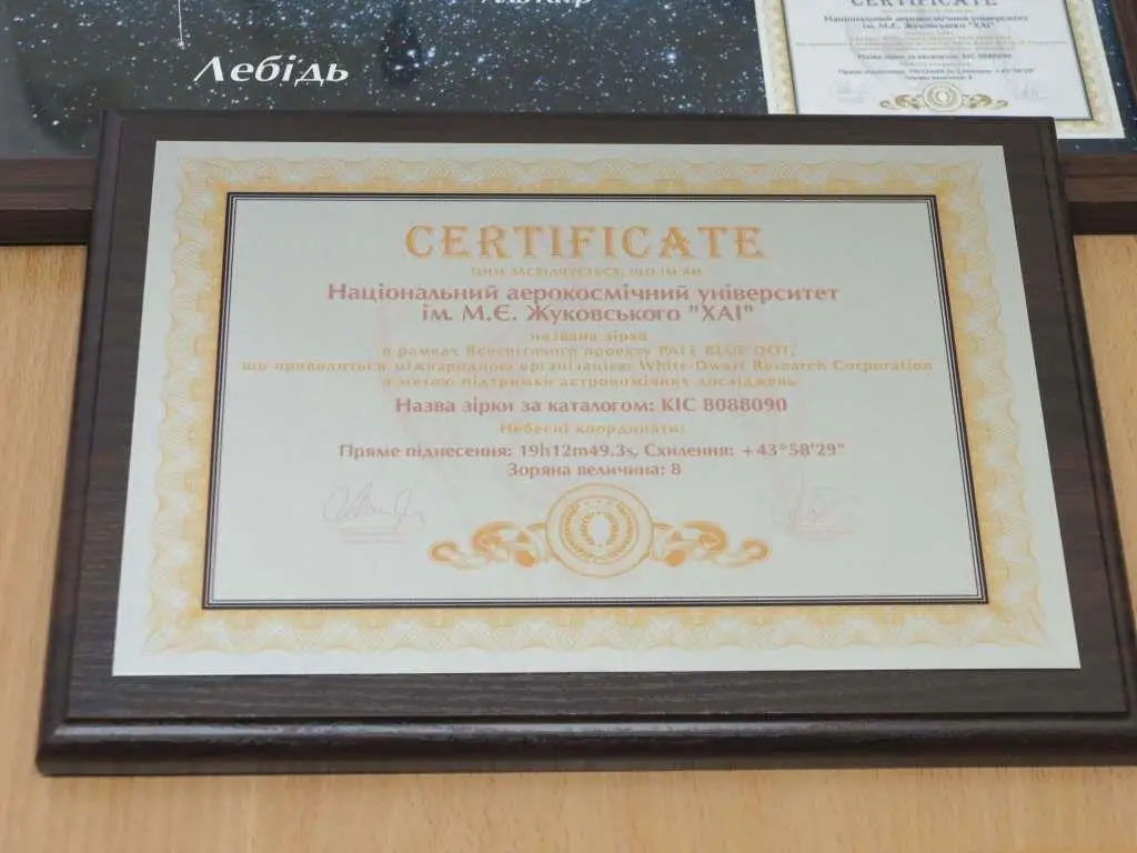 Насамкінець нагородної частини засідання було презентовано сертифікат, який засвідчує, що на честь Національного аерокосмічного університету ім. М. Є. Жуковського «Харківський авіаційний інститут» названо зірку KIC 8088090 (за каталогом), яка має такі координати: