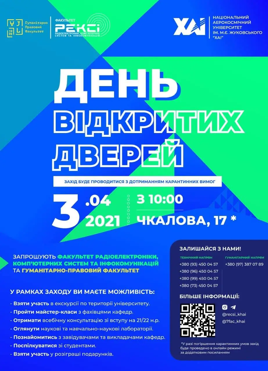 Ми запрошуємо тебе, твоїх друзів і батьків відвідати офлайн або онлайн День відкритих дверей двох крутих факультетів славетного ХАІ. На власні очі ти побачиш, які актуальні знання й вміння зможеш отримати у нас, дізнаєшся, хто, де і як навчає молодих фахівців, почуєш думки й враження студентів, випускників, познайомишся з культурним і спортивним життям університету, і, крім того, матимеш змогу взяти участь у цікавих конкурсах.