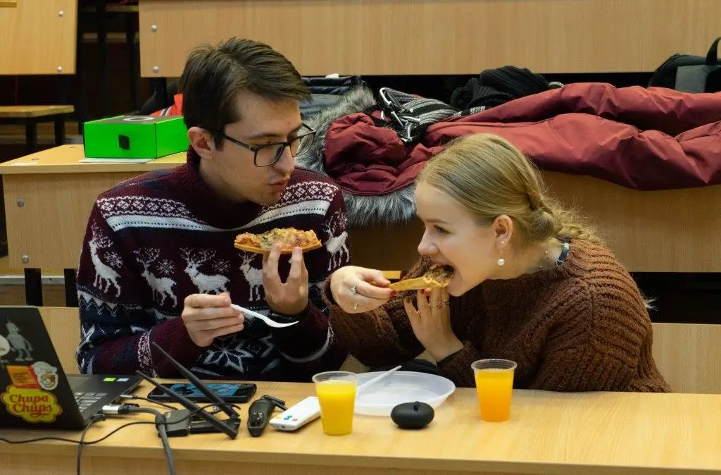 Після виступів було оголошено перерву, і члени журі залишили аудиторію для обговорення вподобань. Можливо (час реклами), художник і має бути голодним, але один зі спонсорів хакатону не розділяв таку позицію: власник ресторану Pasteria, програміст, випускник кафедри 503 Олексій Паньковський пригостив учасників смачною піцою.