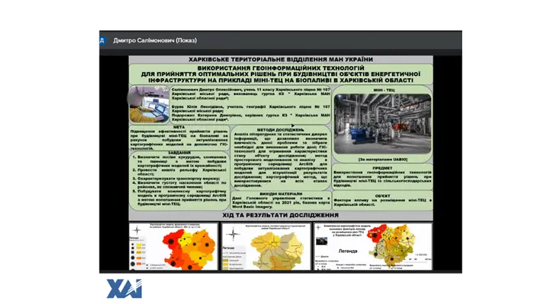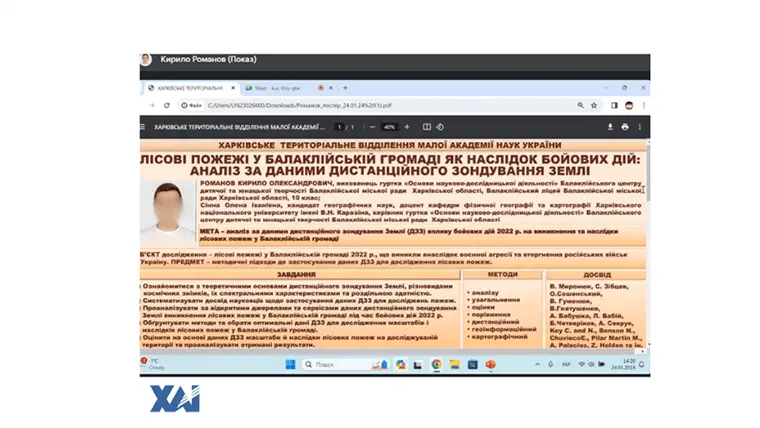 У цей непростий час талановита молодь Харківщини проводила науково-практичні дослідження присвячені наслідкам військових дій, а саме прориву дамби Каховської ГЕС, лісовим пожежам у Балакліївській громаді, руйнуванню ландшафтів у НПП «Дворічанський». Запропоновані ефективні методики визначення ділянок для будівництва міні-ТЕЦ на біопаливі, дослідження геометричних характеристик Азовського моря, навіть розглядалися проблеми зменшення викидів вуглекислого газу за рахунок вегетаріанства. Головним інструментом дослідження, яким користувалися юні дослідники були геоінформаційні системи та технології з використанням даних дистанційного зондування Землі.