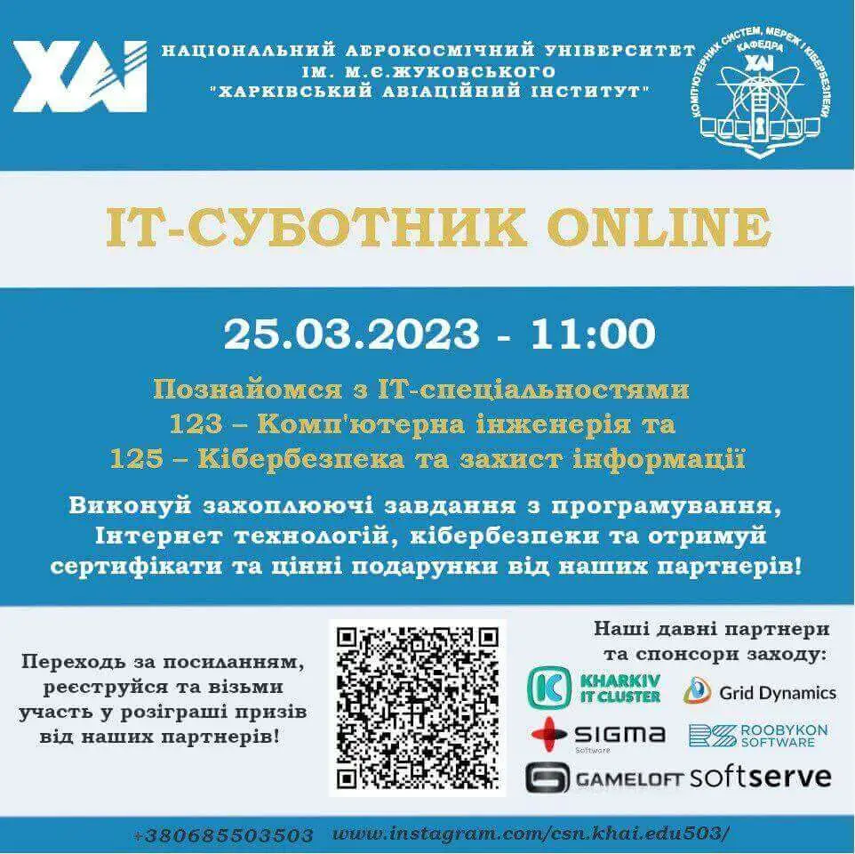 Запрошуємо вас до участі в щорічному заході кафедри комп'ютерних систем, мереж і кібербезпеки (503) факультету радіоелектроніки, комп’ютерних систем та інфокомунікацій (№ 5) «ІТ-Суботник». Цього року він буде проходити також в режимі онлайн.