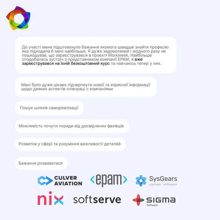 - познайомитися з крутими компаніями — Culver Aviation, EPAM, SysGears, NIX, SoftServe, Sigma Software;