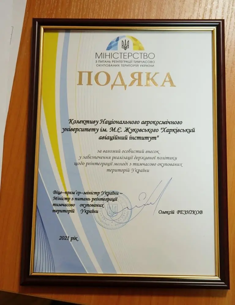 За успішну організацію перших у стінах ХАІ підготовчих курсів зі стипендіальним забезпеченням для молоді з тимчасово окупованих територій та лінії зіткнення, а також загальну плідну агітаційну роботу колектив нашого університету отримав подяку від Міністерства з питань реінтеграції тимчасово окупованих територій України. Про результати роботи сьогодні, 5 жовтня, було звітовано на вебінарі міністерства, де також узяли участь представники інших закладів вищої освіти.