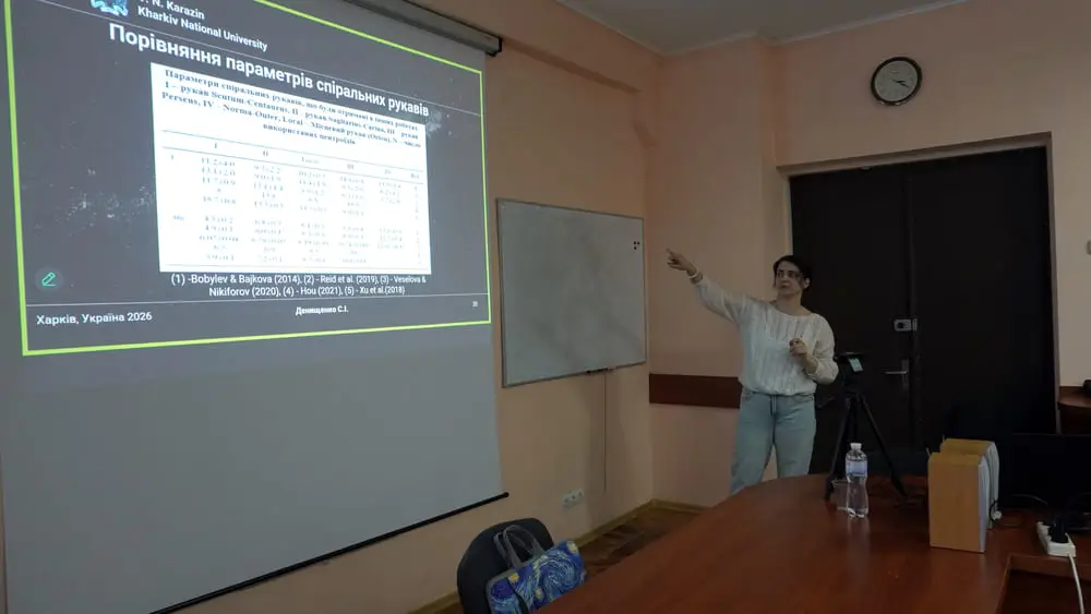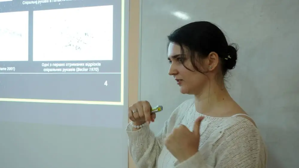 У своїй доповіді дослідниця представила сучасні підходи до вивчення спіральної структури Чумацького Шляху. Йшлося про методи визначення параметрів спіральних рукавів нашої Галактики, аналіз руху зір і міжзоряного газу, а також про моделі, що дозволяють відтворити будову галактичного диска. Окрему увагу було приділено питанням кількості спіральних рукавів Чумацького Шляху, їхньої геометрії та розташуванню Сонячної системи в локальному рукаві Оріона.