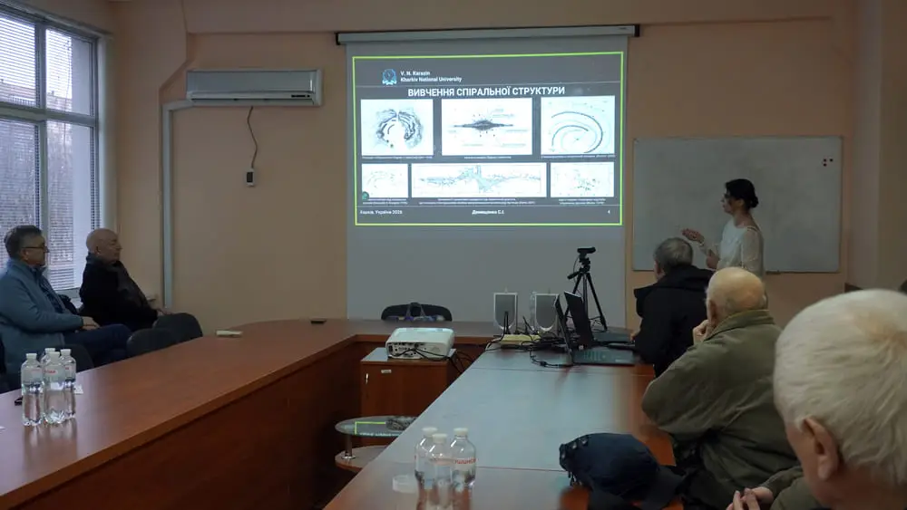 Цього разу зустріч була присвячена проблемам астрофізики. Учасники заслухали та обговорили доповідь старшої викладачки кафедри фізики ХАІ (№505), доктора філософії Софії Денищенко на тему «Структурні особливості Галактики за результатами кінематичного аналізу».