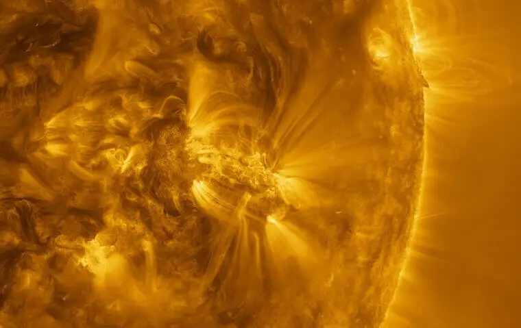 На новому знімку видно зовнішній шар атмосфери Сонця — корону, розігріту до мільйонів градусів. Зображення отримано в крайній ультрафіолетовій області спектру, на довжині хвилі 17,4 нанометра. Корональні петлі — яскраві дуги в активних ділянках — переплітаються з темними нитками та протуберанцями.