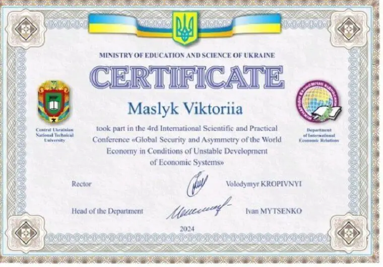 1. Татар М. С., Маслик В. С. «Загрози боргової безпеки та вплив боргових фінансів на соціально-економічний розвиток держави в умовах глобальних викликів». Глобальна безпека та асиметричність світового господарства в умовах нестабільного розвитку економічних систем: матеріали IV Міжнародної науково-практичної конференції. Кропивницький, 2024 рік.