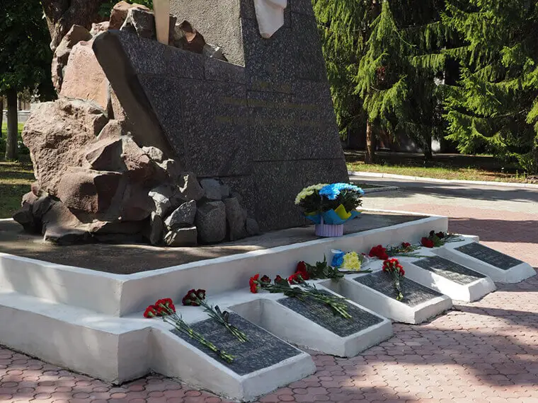 Меморіал студентам, викладачам та співробітникам ХАІ, чиє життя забрала війна… Тут — прізвища тих, хто загинув у бою, помер від ран, не пережив окупацію, був страчений гітлерівцями.