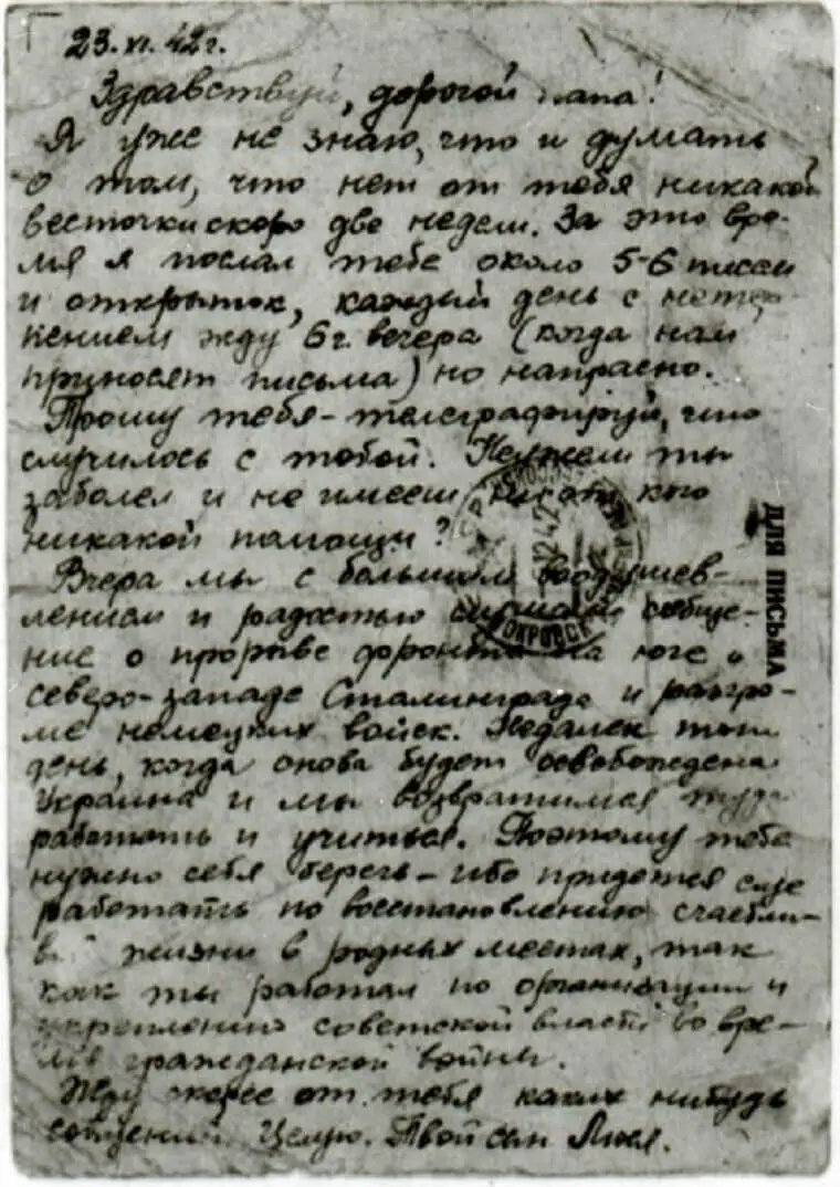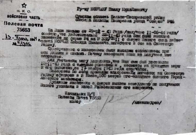 Знаємо, що батьки кілька місяців шукали сина, не маючи від нього звістки. І тільки в червні 1944 року отримали листа від командира військової частини — той самий страшний, чорний лист, який у народі називали «похоронкою»: «Вашого сина поховано за 500 метрів південно-західніше Кирилівського монастиря м. Києва…»