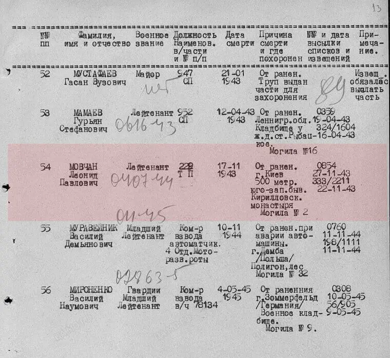 13 листопада 1943 року, у останні дні битви за Київ, командир танка Леонід Мовчан (229-й танковий полк) горів у танку разом з екіпажом, але зміг вибратися з палаючої машини. Через чотири дні, 17 листопада, він помер у шпиталі від страшних ран…