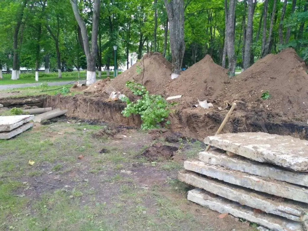 Позаду головного корпусу розрито траншеї. З лопатами ходять працівники, задіяно техніку.