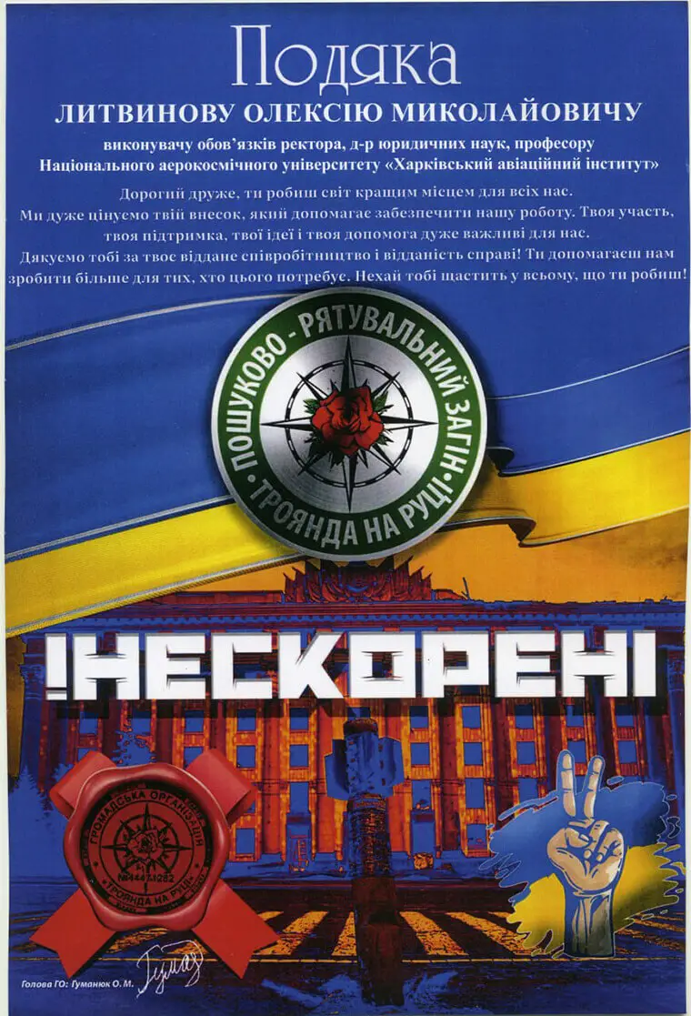 Під час візиту Олександр ГУМАНЮК вручив подяку від громадської організації «Троянда на руці» виконувачу обов’язків ректора ХАІ Олексію ЛИТВИНОВУ — з вдячністю «за підтримку, відданість справі». Ця відзнака — знак поваги до університету за внесок, який допомагає забезпечити роботу волонтерів на передовій.