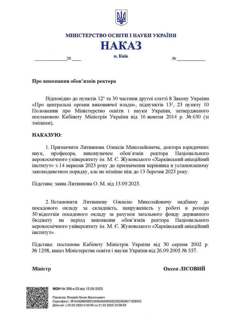 Призначення Литвинова на посаду в.о. ректора відображає визнання його професійних досягнень та лідерських здібностей. Його знання та досвід допоможуть продовжити розвиток Національного аерокосмічного університету ім. М. Є. Жуковського «ХАІ» як установи, що готує кваліфікованих фахівців у галузі аерокосмічних технологій.